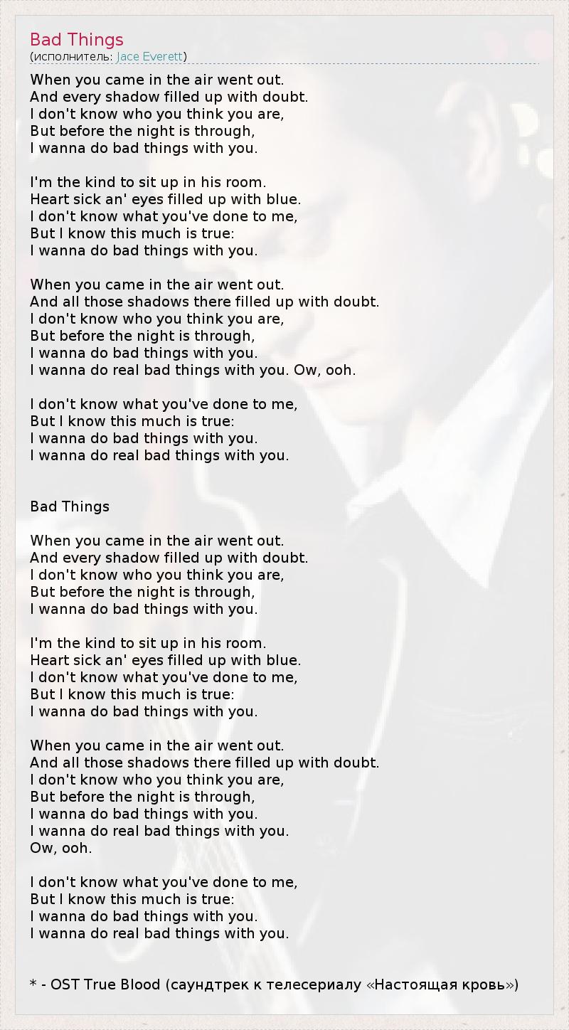 When you came in the air went out. And every shadow filled up with doubt. I don't know who you think you are, But before the night is through, I wanna do bad things with you. I'm the kind to sit up in his room. Heart sick an' eyes filled up with blue. I don't know what you've done to me, But I know this much is true: I wanna do bad things with you. When you came in the air went out. And all those shadows there filled up with doubt. I don't know who you think you are, But before the night is through, I wanna do bad things with you. I wanna do real bad things with you. Ow, ooh. I don't know what you've done to me, But I know this much is true: I wanna do bad things with you. I wanna do real bad things with you. Bad Things When you came in the air went out. And every shadow filled up with doubt. I don't know who you think you are, But before the night is through, I wanna do bad things with you. I'm the kind to sit up in his room. Heart sick an' eyes filled up with blue. I don't know what you've done to me, But I know this much is true: I wanna do bad things with you. When you came in the air went out. And all those shadows there filled up with doubt. I don't know who you think you are, But before the night is through, I wanna do bad things with you. I wanna do real bad things with you. Ow, ooh. I don't know what you've done to me, But I know this much is true: I wanna do bad things with you. I wanna do real bad things with you. * - OST True Blood (саундтрек к телесериалу «Настоящая кровь»)