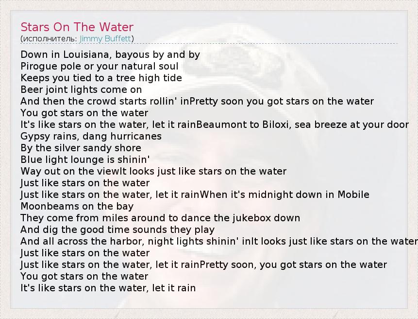 Down in Louisiana, bayous by and by Pirogue pole or your natural soul Keeps you tied to a tree high tide Beer joint lights come on And then the crowd starts rollin' inPretty soon you got stars on the water You got stars on the water It's like stars on the water, let it rainBeaumont to Biloxi, sea breeze at your door Gypsy rains, dang hurricanes By the silver sandy shore Blue light lounge is shinin' Way out on the viewIt looks just like stars on the water Just like stars on the water Just like stars on the water, let it rainWhen it's midnight down in Mobile Moonbeams on the bay They come from miles around to dance the jukebox down And dig the good time sounds they play And all across the harbor, night lights shinin' inIt looks just like stars on the water Just like stars on the water Just like stars on the water, let it rainPretty soon, you got stars on the water You got stars on the water It's like stars on the water, let it rain