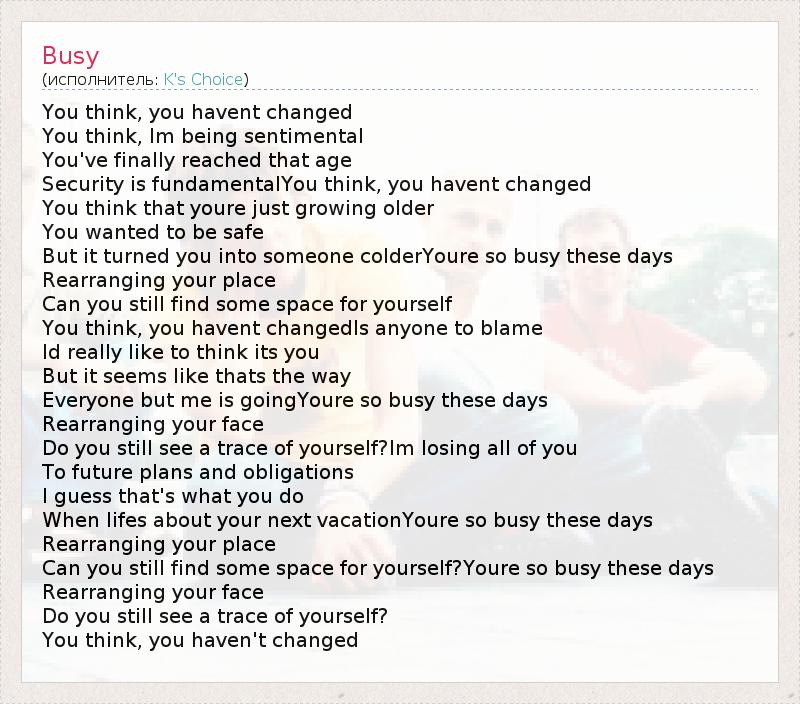 Это интересно:K’s Choice - бельгийская рок-группа из Антверпена. Их стиль можно охарактеризовать как гитарный рок, или фолк-рок.Состав:Сара Беттенс - вокал, гитара.Герт Беттенс - гитара, клавишные, вокал.Эрик Гроссман - бас-гитара.Ян ван Сихем младший - гитара.Коен Лиекенс - ударные.В настоящий момент участники группы работают над сольным проектами. Сара Беттенс выпустила альбом под... продолжение