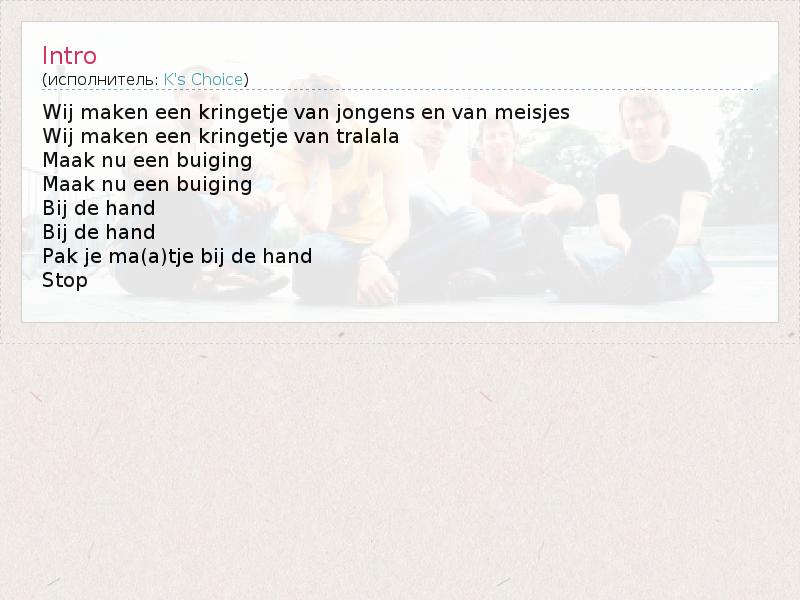 Это интересно:K’s Choice - бельгийская рок-группа из Антверпена. Их стиль можно охарактеризовать как гитарный рок, или фолк-рок.Состав:Сара Беттенс - вокал, гитара.Герт Беттенс - гитара, клавишные, вокал.Эрик Гроссман - бас-гитара.Ян ван Сихем младший - гитара.Коен Лиекенс - ударные.В настоящий момент участники группы работают над сольным проектами. Сара Беттенс выпустила альбом под... продолжение