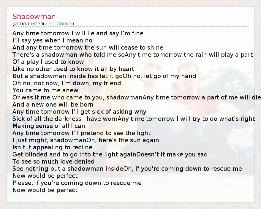 Or was it me who came to you, shadowmanAny time tomorrow a part of me will die