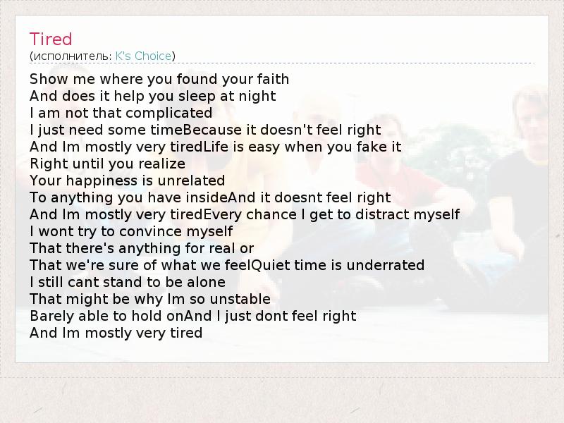 Show me where you found your faith And does it help you sleep at night I am not that complicated I just need some timeBecause it doesn't feel right And Im mostly very tiredLife is easy when you fake it Right until you realize Your happiness is unrelated To anything you have insideAnd it doesnt feel right And Im mostly very tiredEvery chance I get to distract myself I wont try to convince myself That there's anything for real or That we're sure of what we feelQuiet time is underrated I still cant stand to be alone That might be why Im so unstable Barely able to hold onAnd I just dont feel right And Im mostly very tired