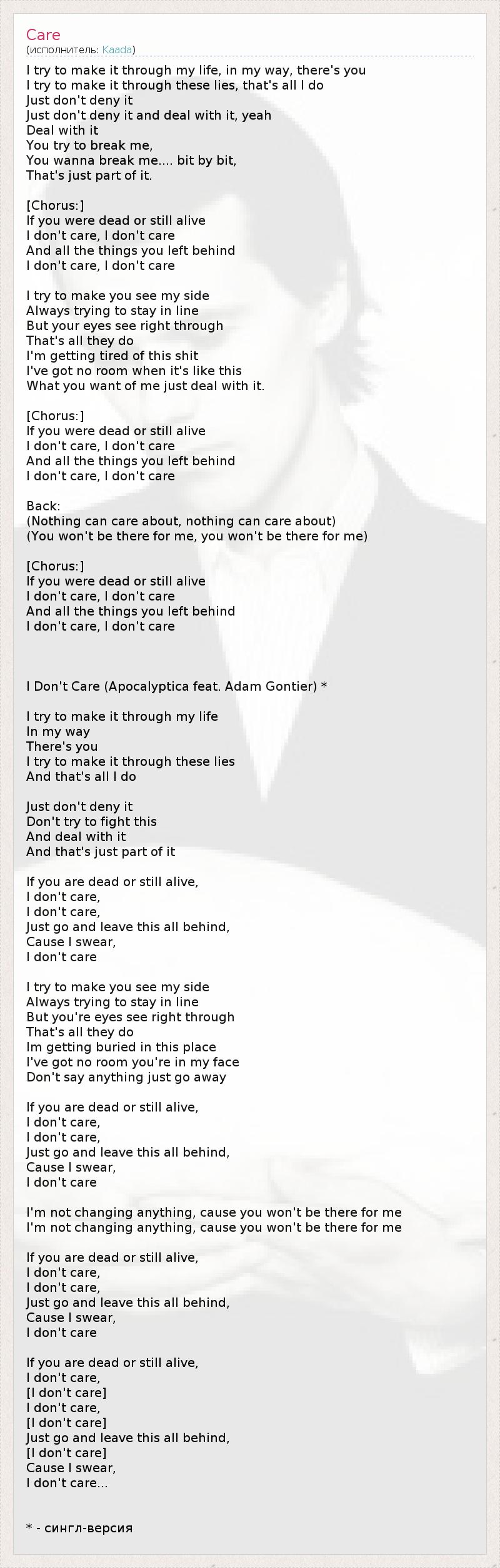 I try to make it through my life, in my way, there's you I try to make it through these lies, that's all I do Just don't deny it Just don't deny it and deal with it, yeah Deal with it You try to break me, You wanna break me.... bit by bit, That's just part of it. [Chorus:] If you were dead or still alive I don't care, I don't care And all the things you left behind I don't care, I don't care I try to make you see my side Always trying to stay in line But your eyes see right through That's all they do I'm getting tired of this shit I've got no room when it's like this What you want of me just deal with it. [Chorus:] If you were dead or still alive I don't care, I don't care And all the things you left behind I don't care, I don't care Back: (Nothing can care about, nothing can care about) (You won't be there for me, you won't be there for me) [Chorus:] If you were dead or still alive I don't care, I don't care And all the things you left behind I don't care, I don't care I Don't Care (Apocalyptica feat. Adam Gontier) * I try to make it through my life In my way There's you I try to make it through these lies And that's all I do Just don't deny it Don't try to fight this And deal with it And that's just part of it If you are dead or still alive, I don't care, I don't care, Just go and leave this all behind, Cause I swear, I don't care I try to make you see my side Always trying to stay in line But you're eyes see right through That's all they do Im getting buried in this place I've got no room you're in my face Don't say anything just go away If you are dead or still alive, I don't care, I don't care, Just go and leave this all behind, Cause I swear, I don't care I'm not changing anything, cause you won't be there for me I'm not changing anything, cause you won't be there for me If you are dead or still alive, I don't care, I don't care, Just go and leave this all behind, Cause I swear, I don't care If you are dead or still alive, I don't care, [I don't care] I don't care, [I don't care] Just go and leave this all behind, [I don't care] Cause I swear, I don't care... * - сингл-версия
