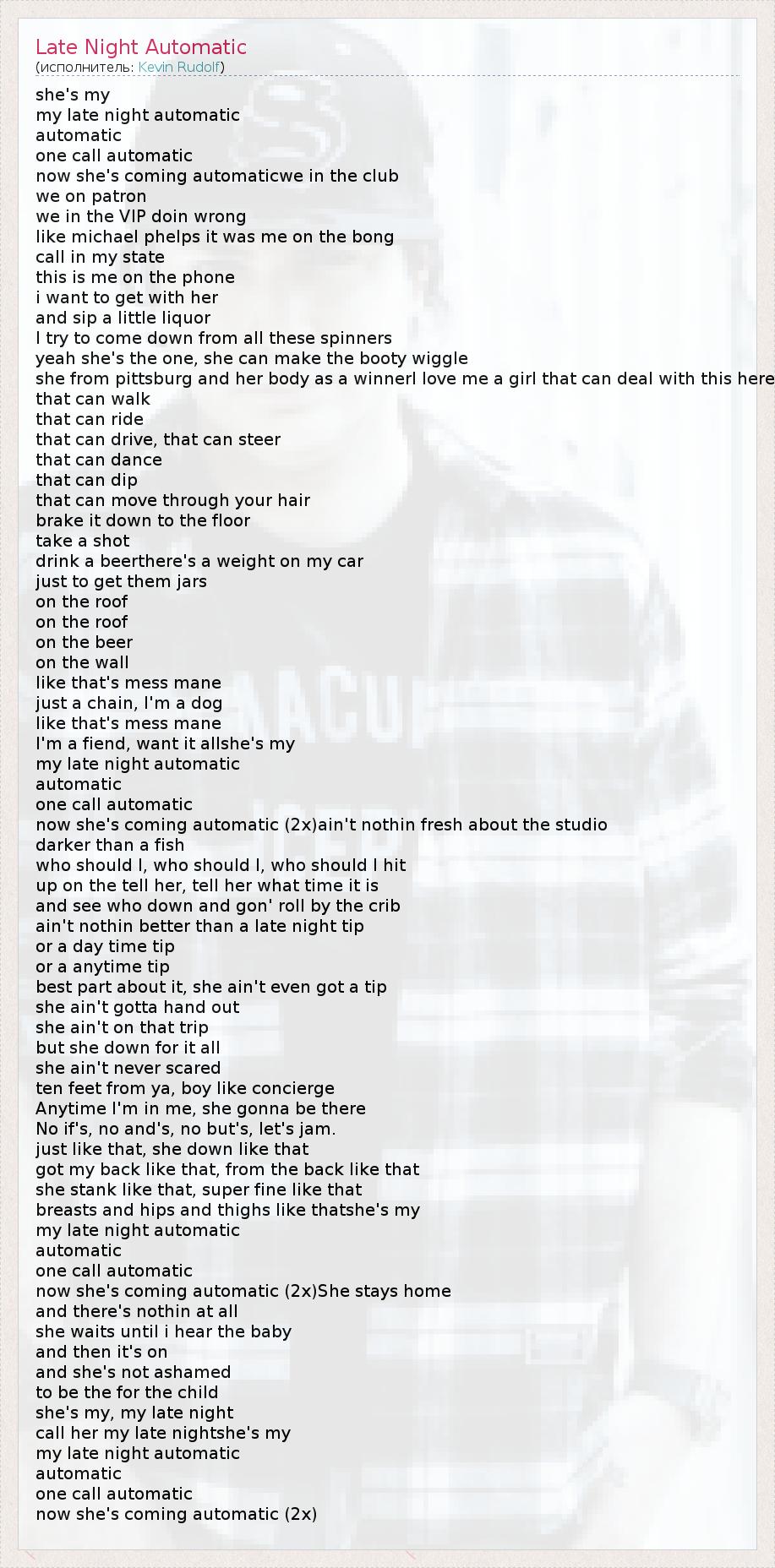 she's my my late night automatic automatic one call automatic now she's coming automaticwe in the club we on patron we in the VIP doin wrong like michael phelps it was me on the bong call in my state this is me on the phone i want to get with her and sip a little liquor I try to come down from all these spinners yeah she's the one, she can make the booty wiggle she from pittsburg and her body as a winnerI love me a girl that can deal with this here that can walk that can ride that can drive, that can steer that can dance that can dip that can move through your hair brake it down to the floor take a shot drink a beerthere's a weight on my car just to get them jars on the roof on the roof on the beer on the wall like that's mess mane just a chain, I'm a dog like that's mess mane I'm a fiend, want it allshe's my my late night automatic automatic one call automatic now she's coming automatic (2x)ain't nothin fresh about the studio darker than a fish who should I, who should I, who should I hit up on the tell her, tell her what time it is and see who down and gon' roll by the crib ain't nothin better than a late night tip or a day time tip or a anytime tip best part about it, she ain't even got a tip she ain't gotta hand out she ain't on that trip but she down for it all she ain't never scared ten feet from ya, boy like concierge Anytime I'm in me, she gonna be there No if's, no and's, no but's, let's jam. just like that, she down like that got my back like that, from the back like that she stank like that, super fine like that breasts and hips and thighs like thatshe's my my late night automatic automatic one call automatic now she's coming automatic (2x)She stays home and there's nothin at all she waits until i hear the baby and then it's on and she's not ashamed to be the for the child she's my, my late night call her my late nightshe's my my late night automatic automatic one call automatic now she's coming automatic (2x)