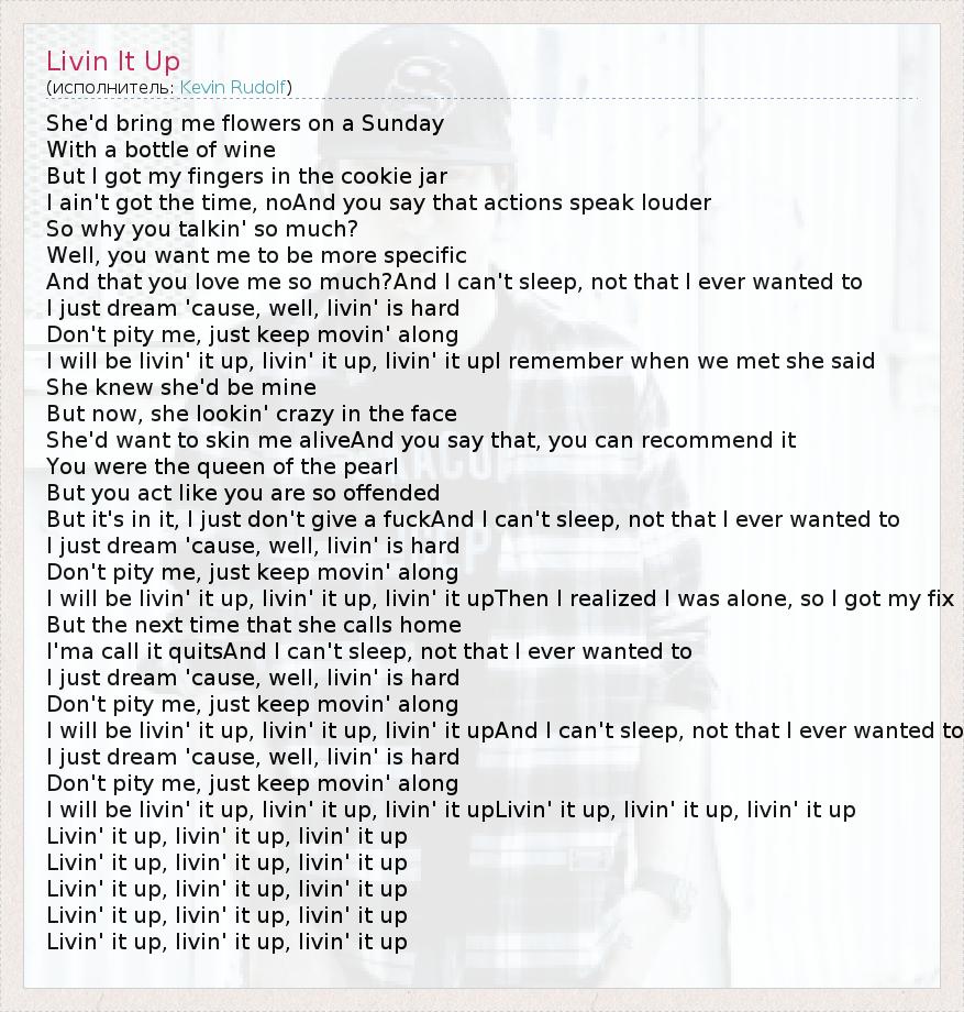 She'd bring me flowers on a Sunday With a bottle of wine But I got my fingers in the cookie jar I ain't got the time, noAnd you say that actions speak louder So why you talkin' so much? Well, you want me to be more specific And that you love me so much?And I can't sleep, not that I ever wanted to I just dream 'cause, well, livin' is hard Don't pity me, just keep movin' along I will be livin' it up, livin' it up, livin' it upI remember when we met she said She knew she'd be mine But now, she lookin' crazy in the face She'd want to skin me aliveAnd you say that, you can recommend it You were the queen of the pearl But you act like you are so offended But it's in it, I just don't give a fuckAnd I can't sleep, not that I ever wanted to I just dream 'cause, well, livin' is hard Don't pity me, just keep movin' along I will be livin' it up, livin' it up, livin' it upThen I realized I was alone, so I got my fix But the next time that she calls home I'ma call it quitsAnd I can't sleep, not that I ever wanted to I just dream 'cause, well, livin' is hard Don't pity me, just keep movin' along I will be livin' it up, livin' it up, livin' it upAnd I can't sleep, not that I ever wanted to I just dream 'cause, well, livin' is hard Don't pity me, just keep movin' along I will be livin' it up, livin' it up, livin' it upLivin' it up, livin' it up, livin' it up Livin' it up, livin' it up, livin' it up Livin' it up, livin' it up, livin' it up Livin' it up, livin' it up, livin' it up Livin' it up, livin' it up, livin' it up Livin' it up, livin' it up, livin' it up