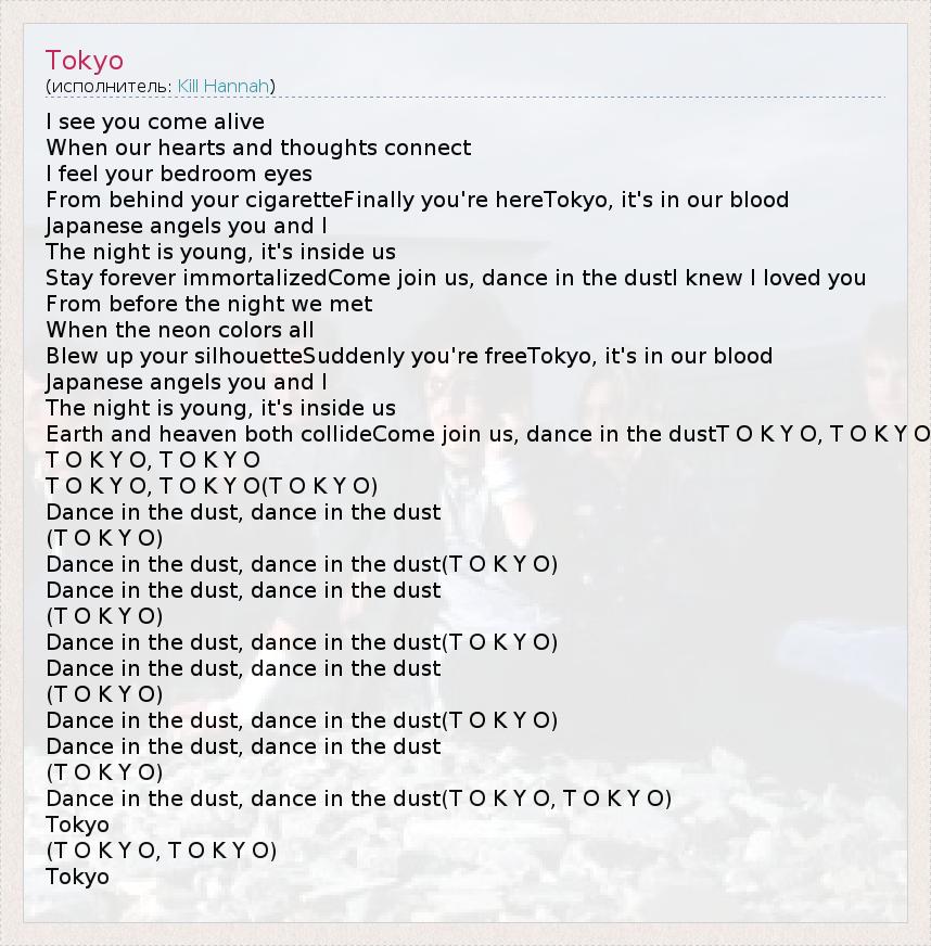 I see you come alive When our hearts and thoughts connect I feel your bedroom eyes From behind your cigaretteFinally you're hereTokyo, it's in our blood Japanese angels you and I The night is young, it's inside us Stay forever immortalizedCome join us, dance in the dustI knew I loved you From before the night we met When the neon colors all Blew up your silhouetteSuddenly you're freeTokyo, it's in our blood Japanese angels you and I The night is young, it's inside us Earth and heaven both collideCome join us, dance in the dustT O K Y O, T O K Y O T O K Y O, T O K Y O T O K Y O, T O K Y O(T O K Y O) Dance in the dust, dance in the dust (T O K Y O) Dance in the dust, dance in the dust(T O K Y O) Dance in the dust, dance in the dust (T O K Y O) Dance in the dust, dance in the dust(T O K Y O) Dance in the dust, dance in the dust (T O K Y O) Dance in the dust, dance in the dust(T O K Y O) Dance in the dust, dance in the dust (T O K Y O) Dance in the dust, dance in the dust(T O K Y O, T O K Y O) Tokyo (T O K Y O, T O K Y O) Tokyo
