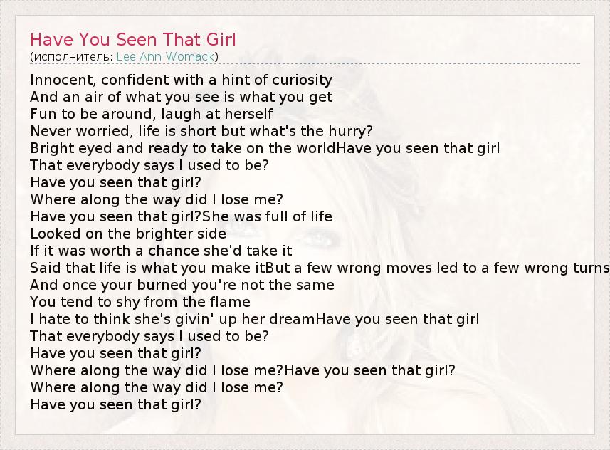 А как ты думаешь, о чем песня "Have You Seen That Girl" ?