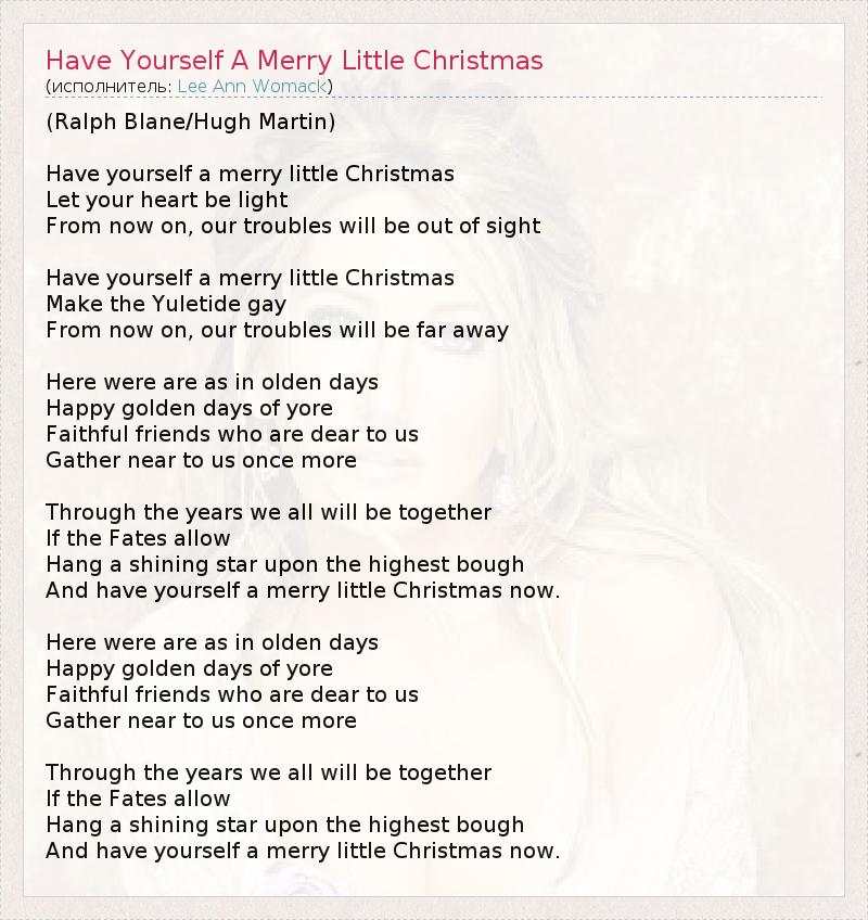 (Ralph Blane/Hugh Martin) Have yourself a merry little Christmas Let your heart be light From now on, our troubles will be out of sight Have yourself a merry little Christmas Make the Yuletide gay From now on, our troubles will be far away Here were are as in olden days Happy golden days of yore Faithful friends who are dear to us Gather near to us once more Through the years we all will be together If the Fates allow Hang a shining star upon the highest bough And have yourself a merry little Christmas now. Here were are as in olden days Happy golden days of yore Faithful friends who are dear to us Gather near to us once more Through the years we all will be together If the Fates allow Hang a shining star upon the highest bough And have yourself a merry little Christmas now.