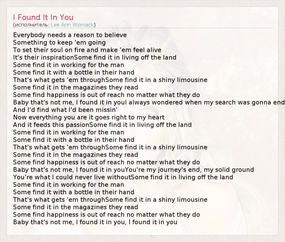 Everybody needs a reason to believe Something to keep 'em going To set their soul on fire and make 'em feel alive It's their inspirationSome find it in living off the land Some find it in working for the man Some find it with a bottle in their hand That's what gets 'em throughSome find it in a shiny limousine Some find it in the magazines they read Some find happiness is out of reach no matter what they do Baby that's not me, I found it in youI always wondered when my search was gonna end And I'd find what I'd been missin' Now everything you are it goes right to my heart And it feeds this passionSome find it in living off the land Some find it in working for the man Some find it with a bottle in their hand That's what gets 'em throughSome find it in a shiny limousine Some find it in the magazines they read Some find happiness is out of reach no matter what they do Baby that's not me, I found it in youYou're my journey's end, my solid ground You're what I could never live withoutSome find it in living off the land Some find it in working for the man Some find it with a bottle in their hand That's what gets 'em throughSome find it in a shiny limousine Some find it in the magazines they read Some find happiness is out of reach no matter what they do Baby that's not me, I found it in you, I found it in you