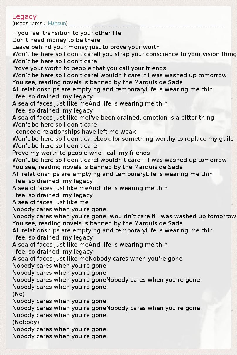 Nobody cares when you're goneI wouldn't care if I was washed up tomorrow