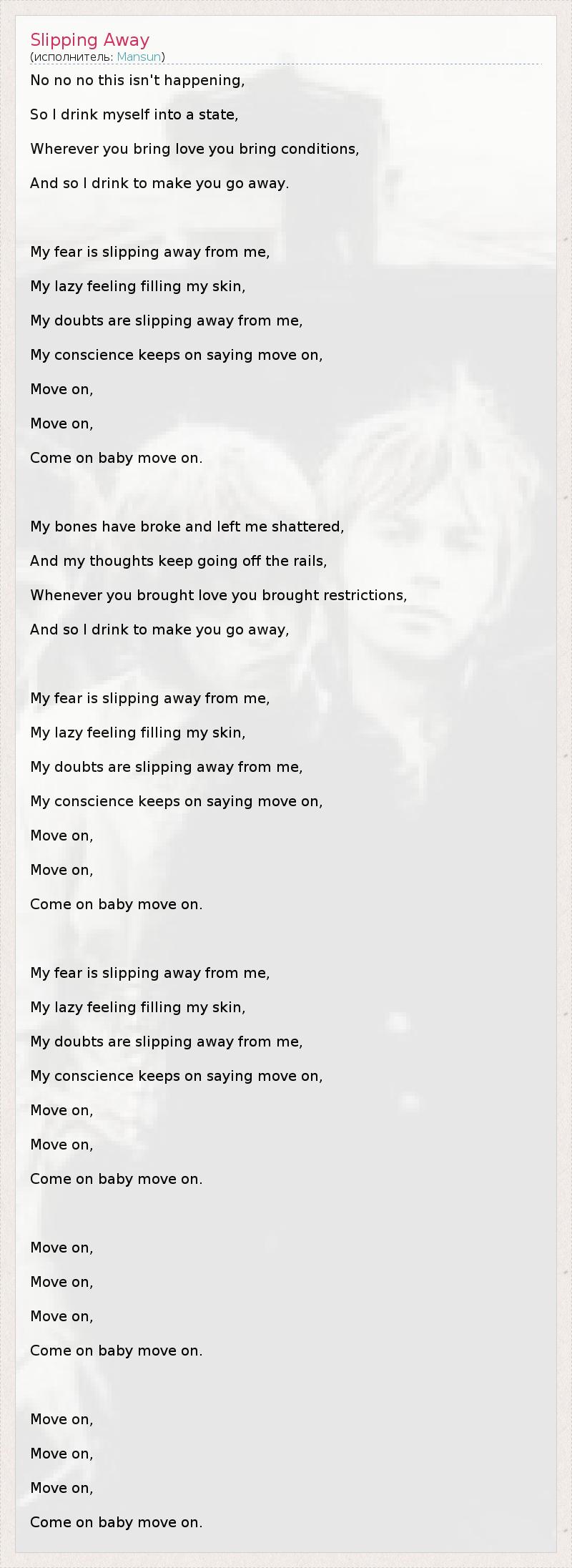 No no no this isn't happening, So I drink myself into a state, Wherever you bring love you bring conditions, And so I drink to make you go away. My fear is slipping away from me, My lazy feeling filling my skin, My doubts are slipping away from me, My conscience keeps on saying move on, Move on, Move on, Come on baby move on. My bones have broke and left me shattered, And my thoughts keep going off the rails, Whenever you brought love you brought restrictions, And so I drink to make you go away, My fear is slipping away from me, My lazy feeling filling my skin, My doubts are slipping away from me, My conscience keeps on saying move on, Move on, Move on, Come on baby move on. My fear is slipping away from me, My lazy feeling filling my skin, My doubts are slipping away from me, My conscience keeps on saying move on, Move on, Move on, Come on baby move on. Move on, Move on, Move on, Come on baby move on. Move on, Move on, Move on, Come on baby move on.