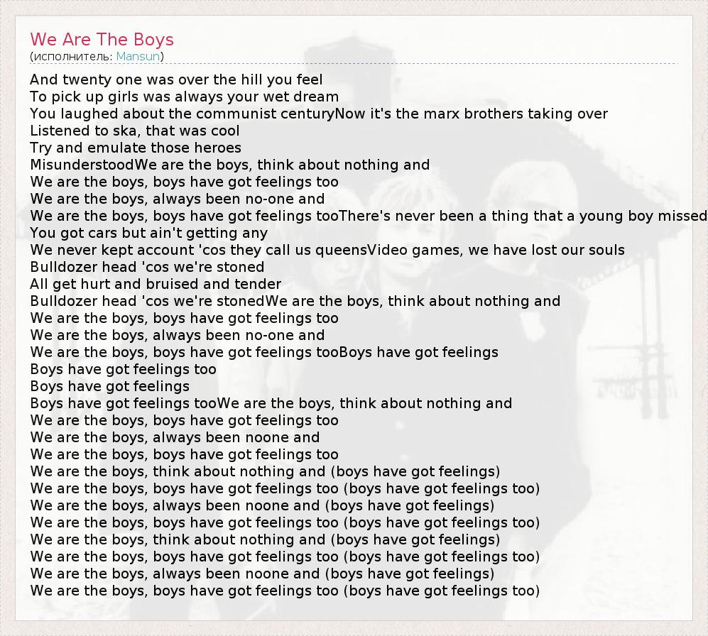 We are the boys, boys have got feelings tooThere's never been a thing that a young boy missed