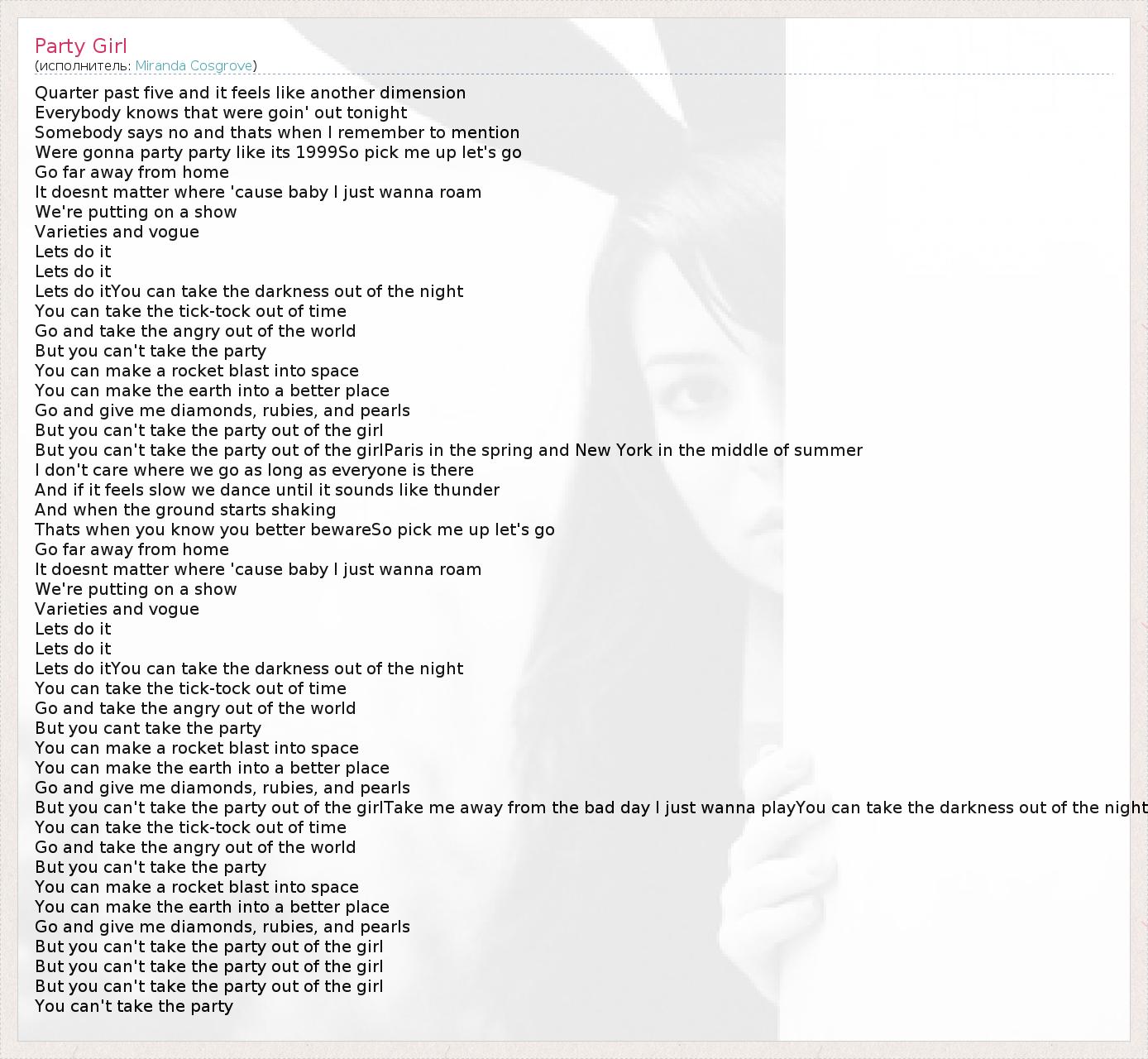 But you can't take the party out of the girlTake me away from the bad day I just wanna playYou can take the darkness out of the night