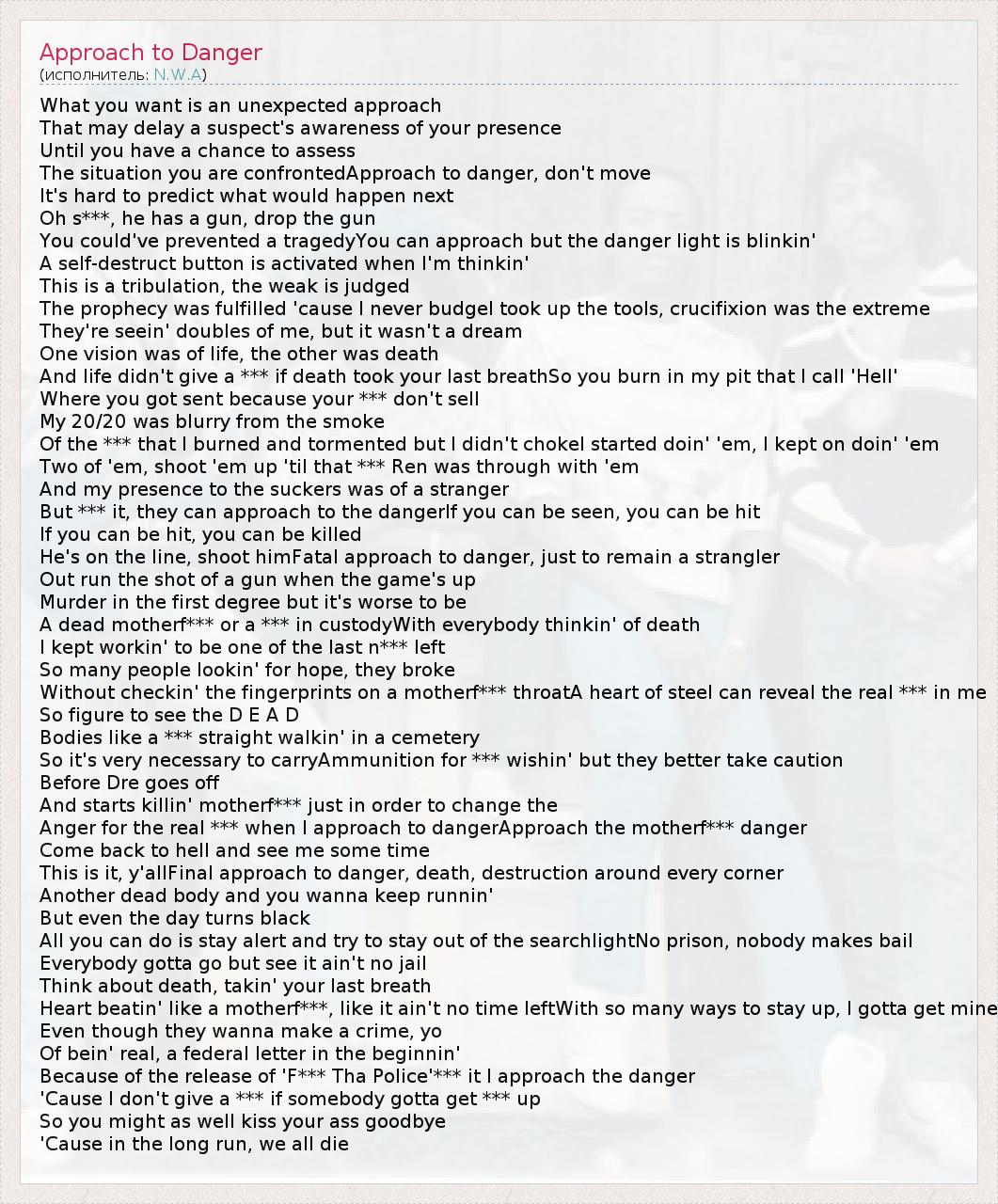 What you want is an unexpected approach That may delay a suspect's awareness of your presence Until you have a chance to assess The situation you are confrontedApproach to danger, don't move It's hard to predict what would happen next Oh s***, he has a gun, drop the gun You could've prevented a tragedyYou can approach but the danger light is blinkin' A self-destruct button is activated when I'm thinkin' This is a tribulation, the weak is judged The prophecy was fulfilled 'cause I never budgeI took up the tools, crucifixion was the extreme They're seein' doubles of me, but it wasn't a dream One vision was of life, the other was death And life didn't give a *** if death took your last breathSo you burn in my pit that I call 'Hell' Where you got sent because your *** don't sell My 20/20 was blurry from the smoke Of the *** that I burned and tormented but I didn't chokeI started doin' 'em, I kept on doin' 'em Two of 'em, shoot 'em up 'til that *** Ren was through with 'em And my presence to the suckers was of a stranger But *** it, they can approach to the dangerIf you can be seen, you can be hit If you can be hit, you can be killed He's on the line, shoot himFatal approach to danger, just to remain a strangler Out run the shot of a gun when the game's up Murder in the first degree but it's worse to be A dead motherf*** or a *** in custodyWith everybody thinkin' of death I kept workin' to be one of the last n*** left So many people lookin' for hope, they broke Without checkin' the fingerprints on a motherf*** throatA heart of steel can reveal the real *** in me So figure to see the D E A D Bodies like a *** straight walkin' in a cemetery So it's very necessary to carryAmmunition for *** wishin' but they better take caution Before Dre goes off And starts killin' motherf*** just in order to change the Anger for the real *** when I approach to dangerApproach the motherf*** danger Come back to hell and see me some time This is it, y'allFinal approach to danger, death, destruction around every corner Another dead body and you wanna keep runnin' But even the day turns black All you can do is stay alert and try to stay out of the searchlightNo prison, nobody makes bail Everybody gotta go but see it ain't no jail Think about death, takin' your last breath Heart beatin' like a motherf***, like it ain't no time leftWith so many ways to stay up, I gotta get mine Even though they wanna make a crime, yo Of bein' real, a federal letter in the beginnin' Because of the release of 'F*** Tha Police'*** it I approach the danger 'Cause I don't give a *** if somebody gotta get *** up So you might as well kiss your ass goodbye 'Cause in the long run, we all die