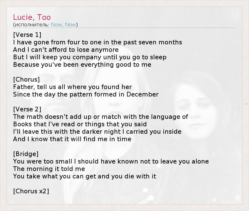 Это интересно:http://nownowband.com/Minneapolis, СШАCacie и Brad встретились в старшей школе, где они вместе играли в оркестре. В первоначальный состав группы входили также Britty (сестра Брэда) и Justin. Britty какое- то время играла с ними во время тура, но в 2010 году поступила в колледж и перестала участвовать в группе. Jess, игравшей ранее в группе Kids Fiction, очень нравилось творчество тогда еще Now,... продолжение