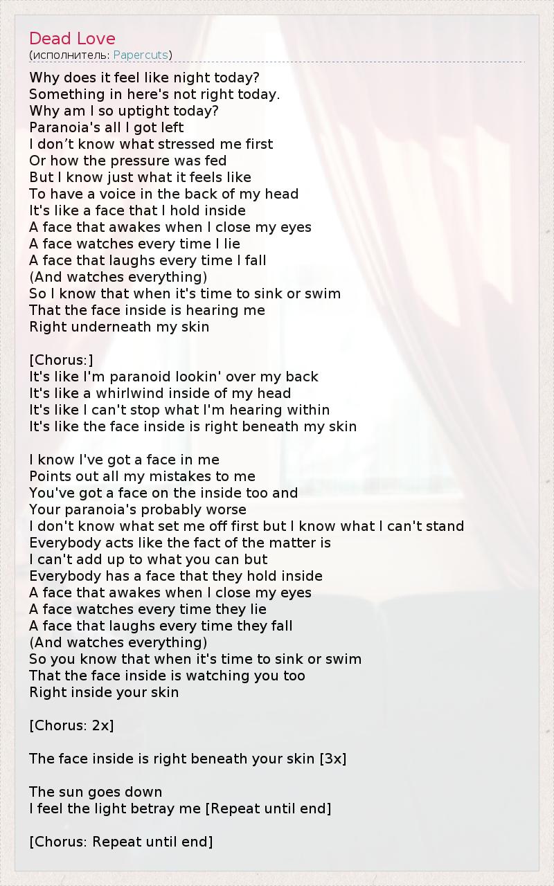 Why does it feel like night today? Something in here's not right today. Why am I so uptight today? Paranoia's all I got left I don’t know what stressed me first Or how the pressure was fed But I know just what it feels like To have a voice in the back of my head It's like a face that I hold inside A face that awakes when I close my eyes A face watches every time I lie A face that laughs every time I fall (And watches everything) So I know that when it's time to sink or swim That the face inside is hearing me Right underneath my skin [Chorus:] It's like I'm paranoid lookin' over my back It's like a whirlwind inside of my head It's like I can't stop what I'm hearing within It's like the face inside is right beneath my skin I know I've got a face in me Points out all my mistakes to me You've got a face on the inside too and Your paranoia's probably worse I don't know what set me off first but I know what I can't stand Everybody acts like the fact of the matter is I can't add up to what you can but Everybody has a face that they hold inside A face that awakes when I close my eyes A face watches every time they lie A face that laughs every time they fall (And watches everything) So you know that when it's time to sink or swim That the face inside is watching you too Right inside your skin [Chorus: 2x] The face inside is right beneath your skin [3x] The sun goes down I feel the light betray me [Repeat until end] [Chorus: Repeat until end]