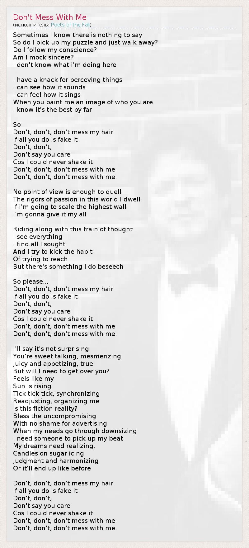 Sometimes I know there is nothing to say So do I pick up my puzzle and just walk away? Do I follow my conscience? Am I mock sincere? I don't know what i'm doing here I have a knack for perceving things I can see how it sounds I can feel how it sings When you paint me an image of who you are I know it's the best by far So Don't, don't, don't mess my hair If all you do is fake it Don't, don't, Don't say you care Cos I could never shake it Don't, don't, don't mess with me Don't, don't, don't mess with me No point of view is enough to quell The rigors of passion in this world I dwell If i'm going to scale the highest wall I'm gonna give it my all Riding along with this train of thought I see everything I find all I sought And I try to kick the habit Of trying to reach But there's something I do beseech So please... Don't, don't, don't mess my hair If all you do is fake it Don't, don't, Don't say you care Cos I could never shake it Don't, don't, don't mess with me Don't, don't, don't mess with me I'll say it's not surprising You're sweet talking, mesmerizing Juicy and appetizing, true But will I need to get over you? Feels like my Sun is rising Tick tick tick, synchronizing Readjusting, organizing me Is this fiction reality? Bless the uncompromising With no shame for advertising When my needs go through downsizing I need someone to pick up my beat My dreams need realizing, Candles on sugar icing Judgment and harmonizing Or it'll end up like before Don't, don't, don't mess my hair If all you do is fake it Don't, don't, Don't say you care Cos I could never shake it Don't, don't, don't mess with me Don't, don't, don't mess with me