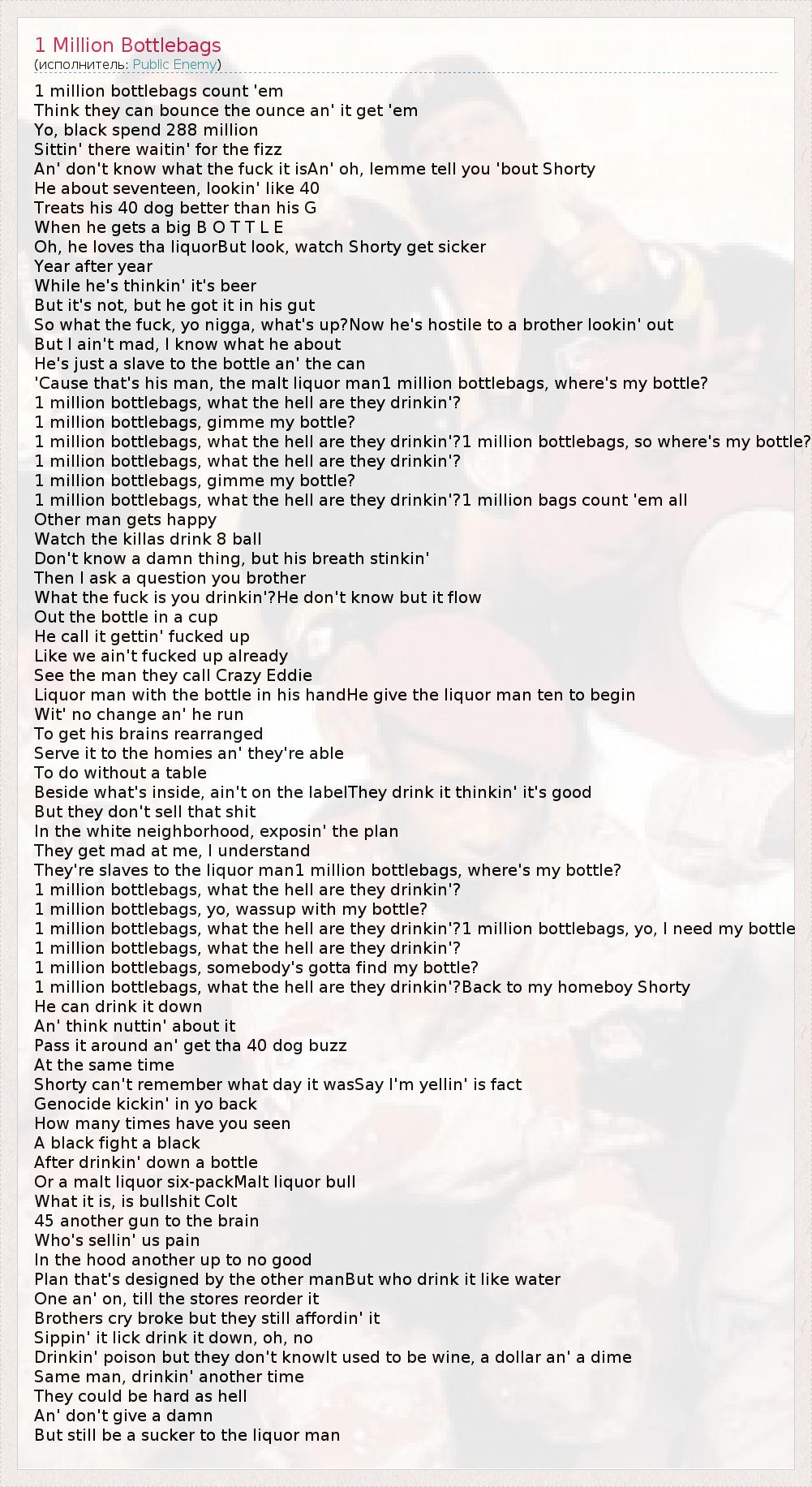 'Cause that's his man, the malt liquor man1 million bottlebags, where's my bottle?