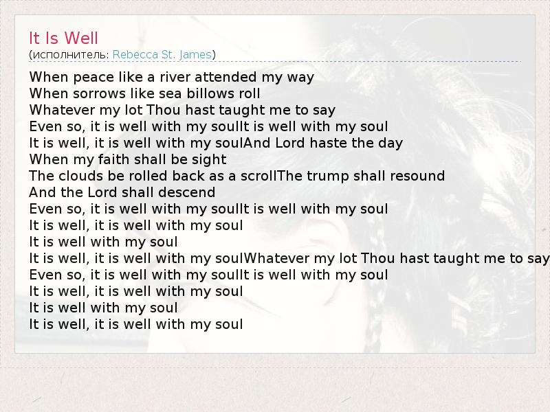 When peace like a river attended my way When sorrows like sea billows roll Whatever my lot Thou hast taught me to say Even so, it is well with my soulIt is well with my soul It is well, it is well with my soulAnd Lord haste the day When my faith shall be sight The clouds be rolled back as a scrollThe trump shall resound And the Lord shall descend Even so, it is well with my soulIt is well with my soul It is well, it is well with my soul It is well with my soul It is well, it is well with my soulWhatever my lot Thou hast taught me to say Even so, it is well with my soulIt is well with my soul It is well, it is well with my soul It is well with my soul It is well, it is well with my soul