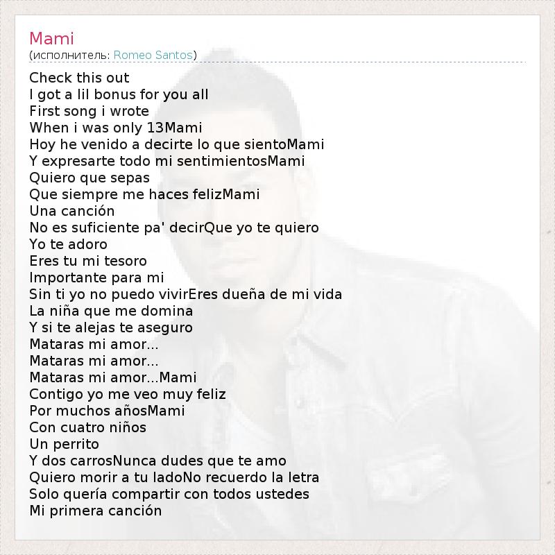 Check this out I got a lil bonus for you all First song i wrote When i was only 13Mami Hoy he venido a decirte lo que sientoMami Y expresarte todo mi sentimientosMami Quiero que sepas Que siempre me haces felizMami Una canción No es suficiente pa' decirQue yo te quiero Yo te adoro Eres tu mi tesoro Importante para mi Sin ti yo no puedo vivirEres dueña de mi vida La niña que me domina Y si te alejas te aseguro Mataras mi amor... Mataras mi amor... Mataras mi amor...Mami Contigo yo me veo muy feliz Por muchos añosMami Con cuatro niños Un perrito Y dos carrosNunca dudes que te amo Quiero morir a tu ladoNo recuerdo la letra Solo quería compartir con todos ustedes Mi primera canción