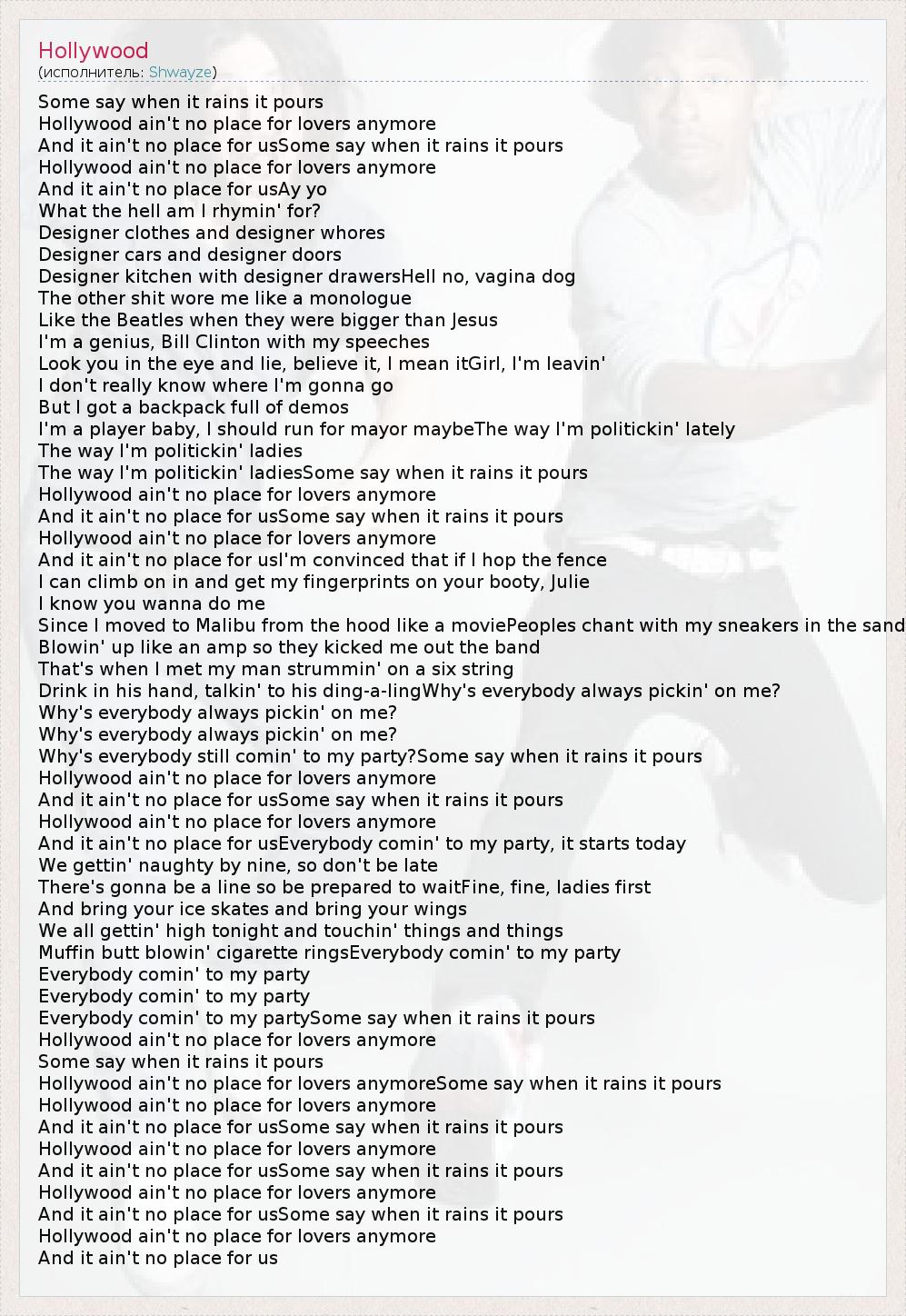 Some say when it rains it pours Hollywood ain't no place for lovers anymore And it ain't no place for usSome say when it rains it pours Hollywood ain't no place for lovers anymore And it ain't no place for usAy yo What the hell am I rhymin' for? Designer clothes and designer whores Designer cars and designer doors Designer kitchen with designer drawersHell no, vagina dog The other shit wore me like a monologue Like the Beatles when they were bigger than Jesus I'm a genius, Bill Clinton with my speeches Look you in the eye and lie, believe it, I mean itGirl, I'm leavin' I don't really know where I'm gonna go But I got a backpack full of demos I'm a player baby, I should run for mayor maybeThe way I'm politickin' lately The way I'm politickin' ladies The way I'm politickin' ladiesSome say when it rains it pours Hollywood ain't no place for lovers anymore And it ain't no place for usSome say when it rains it pours Hollywood ain't no place for lovers anymore And it ain't no place for usI'm convinced that if I hop the fence I can climb on in and get my fingerprints on your booty, Julie I know you wanna do me Since I moved to Malibu from the hood like a moviePeoples chant with my sneakers in the sand Blowin' up like an amp so they kicked me out the band That's when I met my man strummin' on a six string Drink in his hand, talkin' to his ding-a-lingWhy's everybody always pickin' on me? Why's everybody always pickin' on me? Why's everybody always pickin' on me? Why's everybody still comin' to my party?Some say when it rains it pours Hollywood ain't no place for lovers anymore And it ain't no place for usSome say when it rains it pours Hollywood ain't no place for lovers anymore And it ain't no place for usEverybody comin' to my party, it starts today We gettin' naughty by nine, so don't be late There's gonna be a line so be prepared to waitFine, fine, ladies first And bring your ice skates and bring your wings We all gettin' high tonight and touchin' things and things Muffin butt blowin' cigarette ringsEverybody comin' to my party Everybody comin' to my party Everybody comin' to my party Everybody comin' to my partySome say when it rains it pours Hollywood ain't no place for lovers anymore Some say when it rains it pours Hollywood ain't no place for lovers anymoreSome say when it rains it pours Hollywood ain't no place for lovers anymore And it ain't no place for usSome say when it rains it pours Hollywood ain't no place for lovers anymore And it ain't no place for usSome say when it rains it pours Hollywood ain't no place for lovers anymore And it ain't no place for usSome say when it rains it pours Hollywood ain't no place for lovers anymore And it ain't no place for us