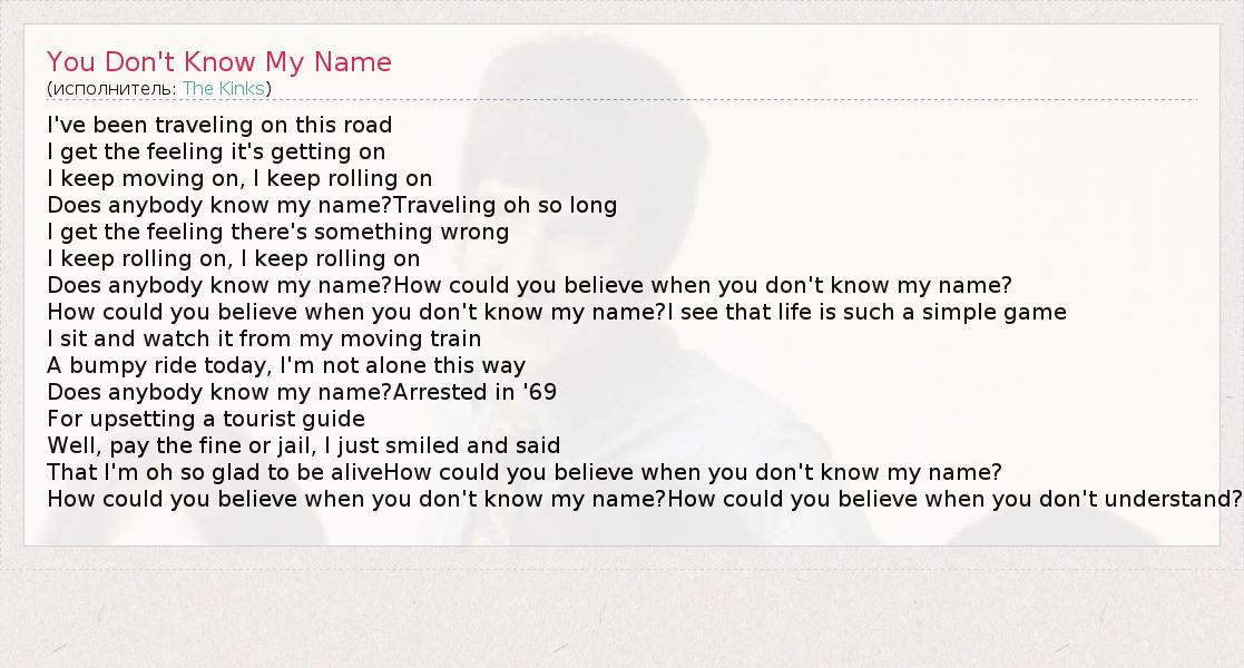 I've been traveling on this road I get the feeling it's getting on I keep moving on, I keep rolling on Does anybody know my name?Traveling oh so long I get the feeling there's something wrong I keep rolling on, I keep rolling on Does anybody know my name?How could you believe when you don't know my name? How could you believe when you don't know my name?I see that life is such a simple game I sit and watch it from my moving train A bumpy ride today, I'm not alone this way Does anybody know my name?Arrested in '69 For upsetting a tourist guide Well, pay the fine or jail, I just smiled and said That I'm oh so glad to be aliveHow could you believe when you don't know my name? How could you believe when you don't know my name?How could you believe when you don't understand?