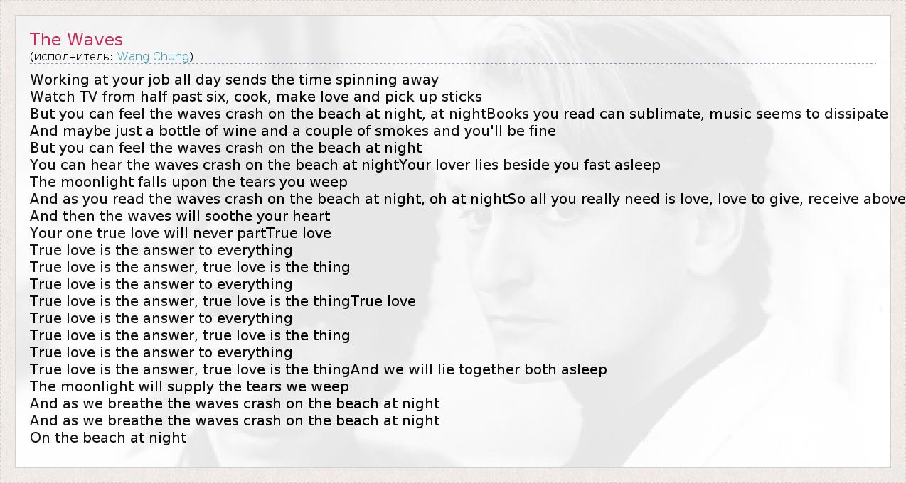 Working at your job all day sends the time spinning away Watch TV from half past six, cook, make love and pick up sticks But you can feel the waves crash on the beach at night, at nightBooks you read can sublimate, music seems to dissipate And maybe just a bottle of wine and a couple of smokes and you'll be fine But you can feel the waves crash on the beach at night You can hear the waves crash on the beach at nightYour lover lies beside you fast asleep The moonlight falls upon the tears you weep And as you read the waves crash on the beach at night, oh at nightSo all you really need is love, love to give, receive above And then the waves will soothe your heart Your one true love will never partTrue love True love is the answer to everything True love is the answer, true love is the thing True love is the answer to everything True love is the answer, true love is the thingTrue love True love is the answer to everything True love is the answer, true love is the thing True love is the answer to everything True love is the answer, true love is the thingAnd we will lie together both asleep The moonlight will supply the tears we weep And as we breathe the waves crash on the beach at night And as we breathe the waves crash on the beach at night On the beach at night