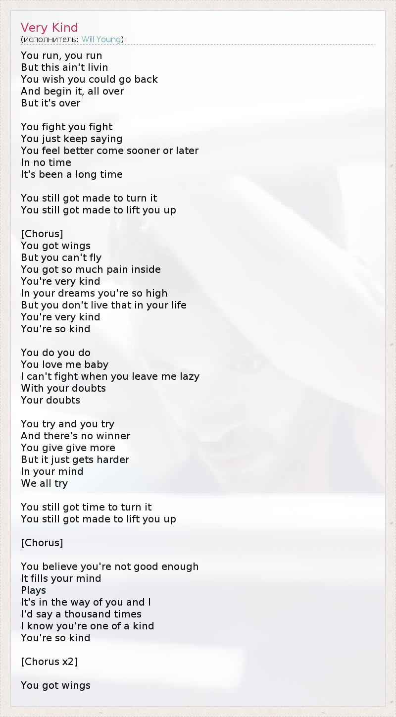You run, you run But this ain't livin You wish you could go back And begin it, all over But it's over You fight you fight You just keep saying You feel better come sooner or later In no time It's been a long time You still got made to turn it You still got made to lift you up [Chorus] You got wings But you can't fly You got so much pain inside You're very kind In your dreams you're so high But you don't live that in your life You're very kind You're so kind You do you do You love me baby I can't fight when you leave me lazy With your doubts Your doubts You try and you try And there's no winner You give give more But it just gets harder In your mind We all try You still got time to turn it You still got made to lift you up [Chorus] You believe you're not good enough It fills your mind Plays It's in the way of you and I I'd say a thousand times I know you're one of a kind You're so kind [Chorus x2] You got wings