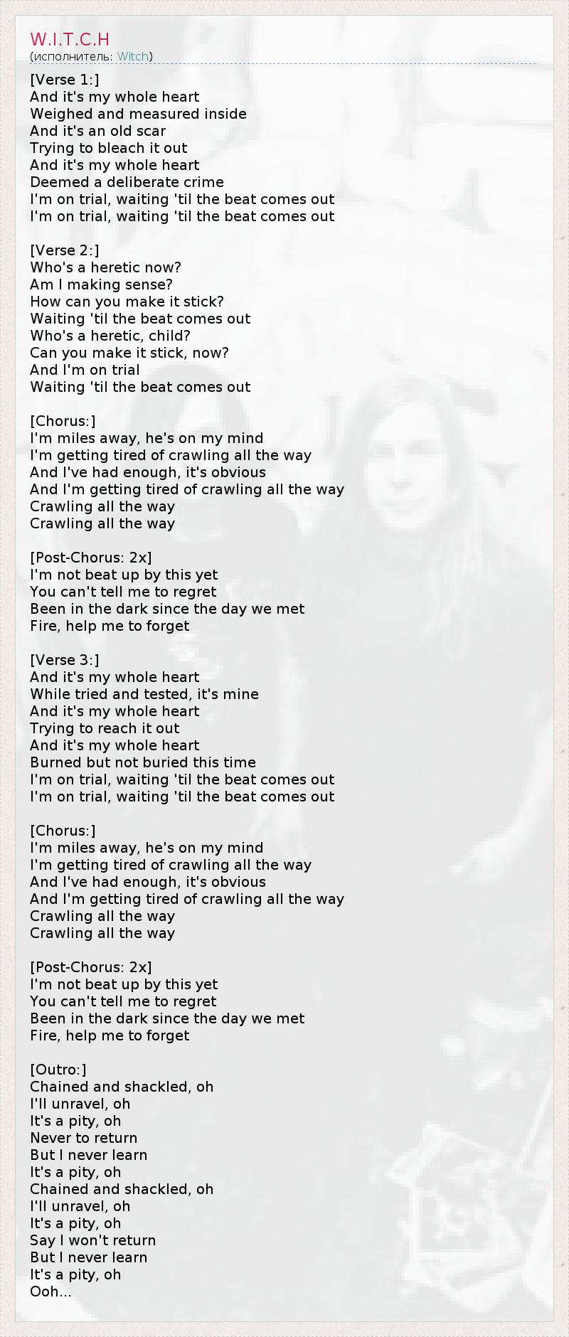 [Verse 1:] And it's my whole heart Weighed and measured inside And it's an old scar Trying to bleach it out And it's my whole heart Deemed a deliberate crime I'm on trial, waiting 'til the beat comes out I'm on trial, waiting 'til the beat comes out [Verse 2:] Who's a heretic now? Am I making sense? How can you make it stick? Waiting 'til the beat comes out Who's a heretic, child? Can you make it stick, now? And I'm on trial Waiting 'til the beat comes out [Chorus:] I'm miles away, he's on my mind I'm getting tired of crawling all the way And I've had enough, it's obvious And I'm getting tired of crawling all the way Crawling all the way Crawling all the way [Post-Chorus: 2x] I'm not beat up by this yet You can't tell me to regret Been in the dark since the day we met Fire, help me to forget [Verse 3:] And it's my whole heart While tried and tested, it's mine And it's my whole heart Trying to reach it out And it's my whole heart Burned but not buried this time I'm on trial, waiting 'til the beat comes out I'm on trial, waiting 'til the beat comes out [Chorus:] I'm miles away, he's on my mind I'm getting tired of crawling all the way And I've had enough, it's obvious And I'm getting tired of crawling all the way Crawling all the way Crawling all the way [Post-Chorus: 2x] I'm not beat up by this yet You can't tell me to regret Been in the dark since the day we met Fire, help me to forget [Outro:] Chained and shackled, oh I'll unravel, oh It's a pity, oh Never to return But I never learn It's a pity, oh Chained and shackled, oh I'll unravel, oh It's a pity, oh Say I won't return But I never learn It's a pity, oh Ooh...