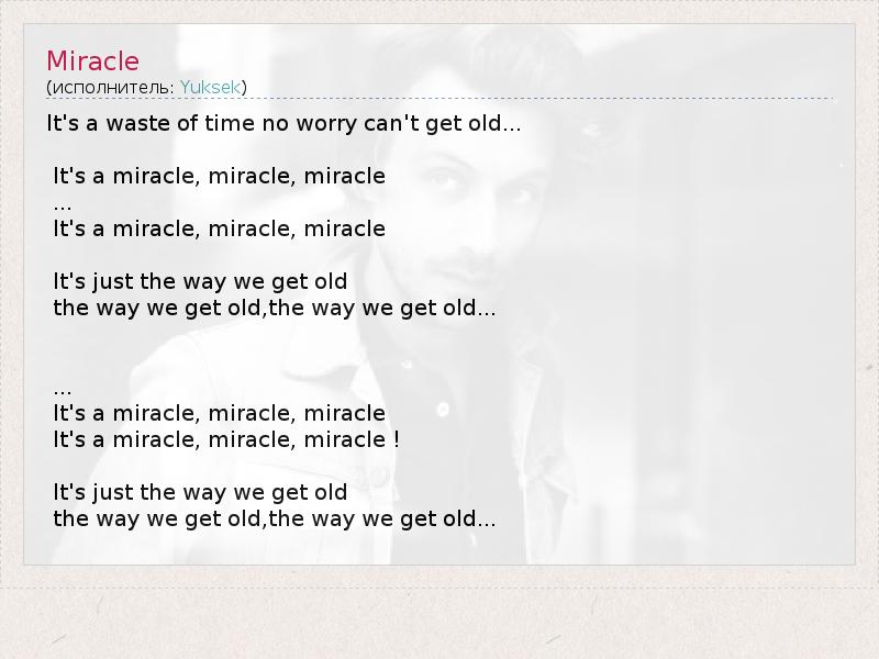 It's a waste of time no worry can't get old... It's a miracle, miracle, miracle ... It's a miracle, miracle, miracle It's just the way we get old the way we get old,the way we get old... ... It's a miracle, miracle, miracle It's a miracle, miracle, miracle ! It's just the way we get old the way we get old,the way we get old...