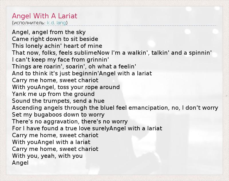 Angel, angel from the sky Came right down to sit beside This lonely achin' heart of mine That now, folks, feels sublimeNow I'm a walkin', talkin' and a spinnin' I can't keep my face from grinnin' Things are roarin', soarin', oh what a feelin' And to think it's just beginnin'Angel with a lariat Carry me home, sweet chariot With youAngel, toss your rope around Yank me up from the ground Sound the trumpets, send a hue Ascending angels through the blueI feel emancipation, no, I don't worry Set my bugaboos down to worry There's no aggravation, there's no worry For I have found a true love surelyAngel with a lariat Carry me home, sweet chariot With youAngel with a lariat Carry me home, sweet chariot With you, yeah, with you Angel