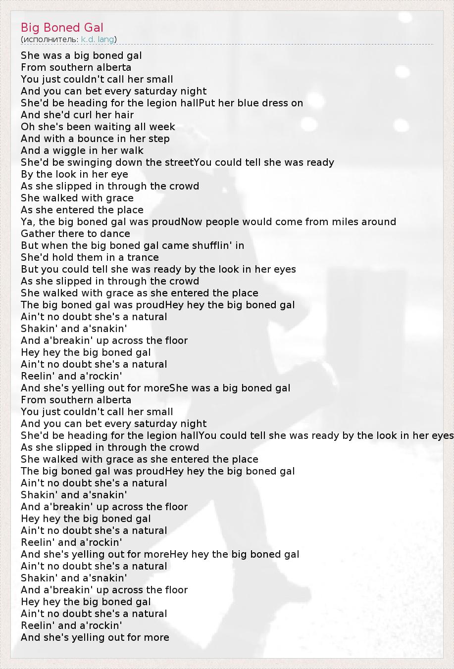 She was a big boned gal From southern alberta You just couldn't call her small And you can bet every saturday night She'd be heading for the legion hallPut her blue dress on And she'd curl her hair Oh she's been waiting all week And with a bounce in her step And a wiggle in her walk She'd be swinging down the streetYou could tell she was ready By the look in her eye As she slipped in through the crowd She walked with grace As she entered the place Ya, the big boned gal was proudNow people would come from miles around Gather there to dance But when the big boned gal came shufflin' in She'd hold them in a trance But you could tell she was ready by the look in her eyes As she slipped in through the crowd She walked with grace as she entered the place The big boned gal was proudHey hey the big boned gal Ain't no doubt she's a natural Shakin' and a'snakin' And a'breakin' up across the floor Hey hey the big boned gal Ain't no doubt she's a natural Reelin' and a'rockin' And she's yelling out for moreShe was a big boned gal From southern alberta You just couldn't call her small And you can bet every saturday night She'd be heading for the legion hallYou could tell she was ready by the look in her eyes As she slipped in through the crowd She walked with grace as she entered the place The big boned gal was proudHey hey the big boned gal Ain't no doubt she's a natural Shakin' and a'snakin' And a'breakin' up across the floor Hey hey the big boned gal Ain't no doubt she's a natural Reelin' and a'rockin' And she's yelling out for moreHey hey the big boned gal Ain't no doubt she's a natural Shakin' and a'snakin' And a'breakin' up across the floor Hey hey the big boned gal Ain't no doubt she's a natural Reelin' and a'rockin' And she's yelling out for more