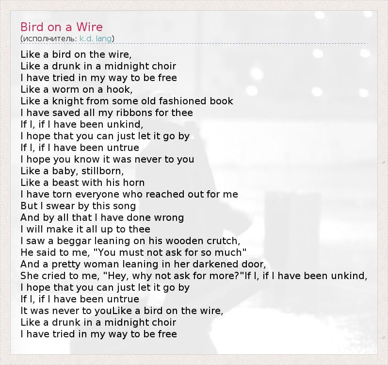 Like a bird on the wire, Like a drunk in a midnight choir I have tried in my way to be free Like a worm on a hook, Like a knight from some old fashioned book I have saved all my ribbons for thee If I, if I have been unkind, I hope that you can just let it go by If I, if I have been untrue I hope you know it was never to you Like a baby, stillborn, Like a beast with his horn I have torn everyone who reached out for me But I swear by this song And by all that I have done wrong I will make it all up to thee I saw a beggar leaning on his wooden crutch, He said to me, "You must not ask for so much" And a pretty woman leaning in her darkened door, She cried to me, "Hey, why not ask for more?"If I, if I have been unkind, I hope that you can just let it go by If I, if I have been untrue It was never to youLike a bird on the wire, Like a drunk in a midnight choir I have tried in my way to be free