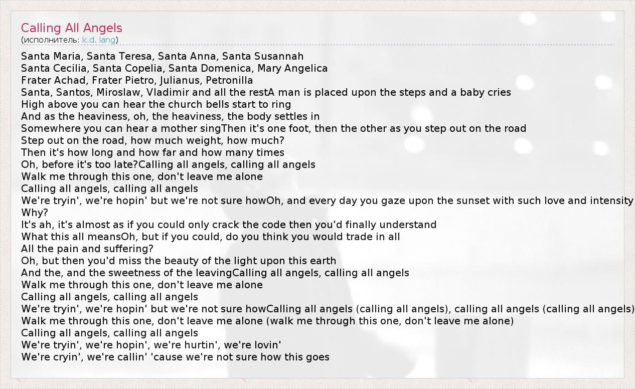 Santa Maria, Santa Teresa, Santa Anna, Santa Susannah Santa Cecilia, Santa Copelia, Santa Domenica, Mary Angelica Frater Achad, Frater Pietro, Julianus, Petronilla Santa, Santos, Miroslaw, Vladimir and all the restA man is placed upon the steps and a baby cries High above you can hear the church bells start to ring And as the heaviness, oh, the heaviness, the body settles in Somewhere you can hear a mother singThen it's one foot, then the other as you step out on the road Step out on the road, how much weight, how much? Then it's how long and how far and how many times Oh, before it's too late?Calling all angels, calling all angels Walk me through this one, don't leave me alone Calling all angels, calling all angels We're tryin', we're hopin' but we're not sure howOh, and every day you gaze upon the sunset with such love and intensity Why? It's ah, it's almost as if you could only crack the code then you'd finally understand What this all meansOh, but if you could, do you think you would trade in all All the pain and suffering? Oh, but then you'd miss the beauty of the light upon this earth And the, and the sweetness of the leavingCalling all angels, calling all angels Walk me through this one, don't leave me alone Calling all angels, calling all angels We're tryin', we're hopin' but we're not sure howCalling all angels (calling all angels), calling all angels (calling all angels) Walk me through this one, don't leave me alone (walk me through this one, don't leave me alone) Calling all angels, calling all angels We're tryin', we're hopin', we're hurtin', we're lovin' We're cryin', we're callin' 'cause we're not sure how this goes