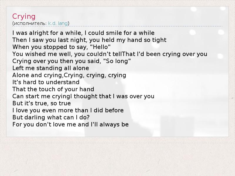 I was alright for a while, I could smile for a while Then I saw you last night, you held my hand so tight When you stopped to say, "Hello" You wished me well, you couldn't tellThat I'd been crying over you Crying over you then you said, "So long" Left me standing all alone Alone and crying,Crying, crying, crying It's hard to understand That the touch of your hand Can start me cryingI thought that I was over you But it's true, so true I love you even more than I did before But darling what can I do? For you don't love me and I'll always be