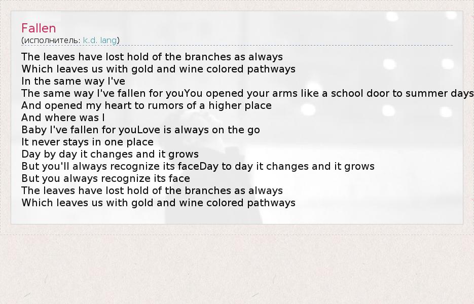 The leaves have lost hold of the branches as always Which leaves us with gold and wine colored pathways In the same way I've The same way I've fallen for youYou opened your arms like a school door to summer days And opened my heart to rumors of a higher place And where was I Baby I've fallen for youLove is always on the go It never stays in one place Day by day it changes and it grows But you'll always recognize its faceDay to day it changes and it grows But you always recognize its face The leaves have lost hold of the branches as always Which leaves us with gold and wine colored pathways