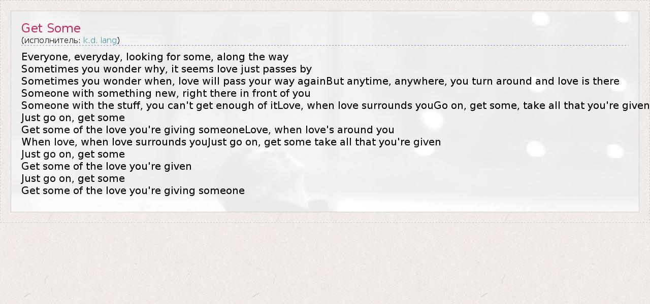 Everyone, everyday, looking for some, along the way Sometimes you wonder why, it seems love just passes by Sometimes you wonder when, love will pass your way againBut anytime, anywhere, you turn around and love is there Someone with something new, right there in front of you Someone with the stuff, you can't get enough of itLove, when love surrounds youGo on, get some, take all that you're given Just go on, get some Get some of the love you're giving someoneLove, when love's around you When love, when love surrounds youJust go on, get some take all that you're given Just go on, get some Get some of the love you're given Just go on, get some Get some of the love you're giving someone