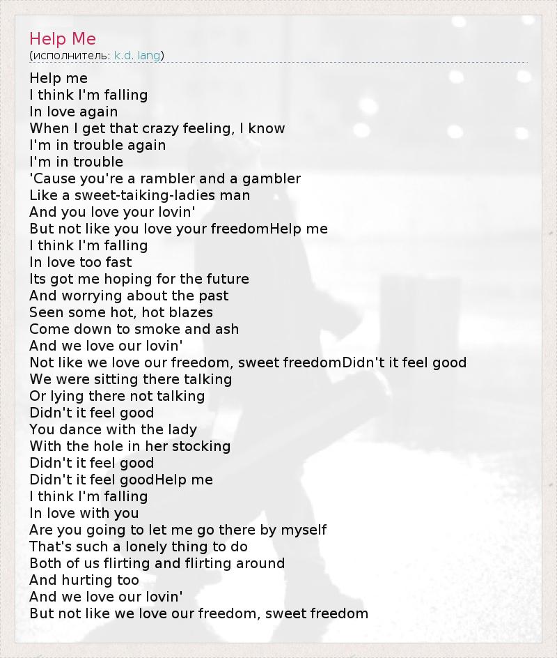 Help me I think I'm falling In love again When I get that crazy feeling, I know I'm in trouble again I'm in trouble 'Cause you're a rambler and a gambler Like a sweet-taiking-ladies man And you love your lovin' But not like you love your freedomHelp me I think I'm falling In love too fast Its got me hoping for the future And worrying about the past Seen some hot, hot blazes Come down to smoke and ash And we love our lovin' Not like we love our freedom, sweet freedomDidn't it feel good We were sitting there talking Or lying there not talking Didn't it feel good You dance with the lady With the hole in her stocking Didn't it feel good Didn't it feel goodHelp me I think I'm falling In love with you Are you going to let me go there by myself That's such a lonely thing to do Both of us flirting and flirting around And hurting too And we love our lovin' But not like we love our freedom, sweet freedom