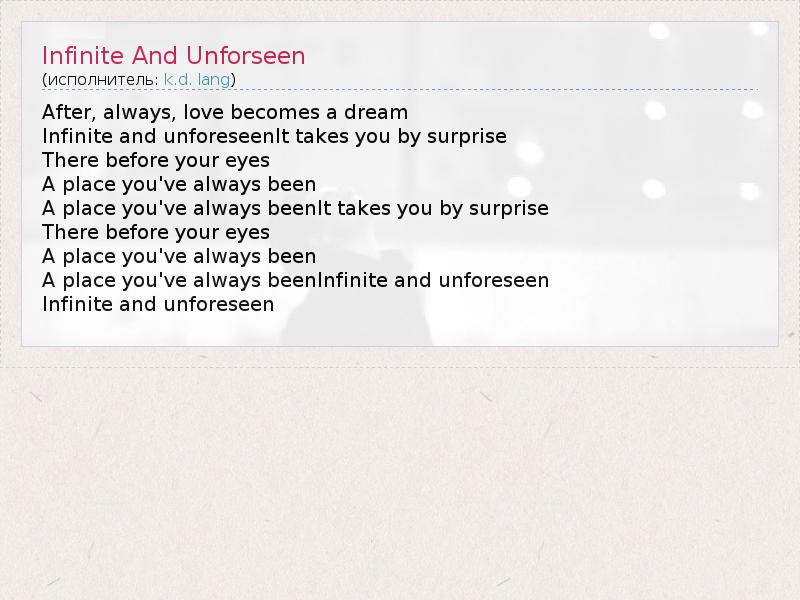 After, always, love becomes a dream Infinite and unforeseenIt takes you by surprise There before your eyes A place you've always been A place you've always beenIt takes you by surprise There before your eyes A place you've always been A place you've always beenInfinite and unforeseen Infinite and unforeseen