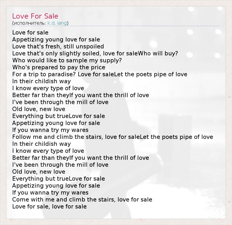 Love for sale Appetizing young love for sale Love that's fresh, still unspoiled Love that's only slightly soiled, love for saleWho will buy? Who would like to sample my supply? Who's prepared to pay the price For a trip to paradise? Love for saleLet the poets pipe of love In their childish way I know every type of love Better far than theyIf you want the thrill of love I've been through the mill of love Old love, new love Everything but trueLove for sale Appetizing young love for sale If you wanna try my wares Follow me and climb the stairs, love for saleLet the poets pipe of love In their childish way I know every type of love Better far than theyIf you want the thrill of love I've been through the mill of love Old love, new love Everything but trueLove for sale Appetizing young love for sale If you wanna try my wares Come with me and climb the stairs, love for sale Love for sale, love for sale