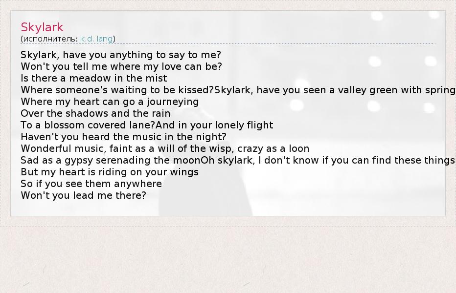 Skylark, have you anything to say to me? Won't you tell me where my love can be? Is there a meadow in the mist Where someone's waiting to be kissed?Skylark, have you seen a valley green with spring Where my heart can go a journeying Over the shadows and the rain To a blossom covered lane?And in your lonely flight Haven't you heard the music in the night? Wonderful music, faint as a will of the wisp, crazy as a loon Sad as a gypsy serenading the moonOh skylark, I don't know if you can find these things But my heart is riding on your wings So if you see them anywhere Won't you lead me there?