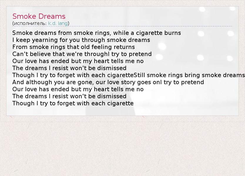 Smoke dreams from smoke rings, while a cigarette burns I keep yearning for you through smoke dreams From smoke rings that old feeling returns Can't believe that we're throughI try to pretend Our love has ended but my heart tells me no The dreams I resist won't be dismissed Though I try to forget with each cigaretteStill smoke rings bring smoke dreams And although you are gone, our love story goes onI try to pretend Our love has ended but my heart tells me no The dreams I resist won't be dismissed Though I try to forget with each cigarette