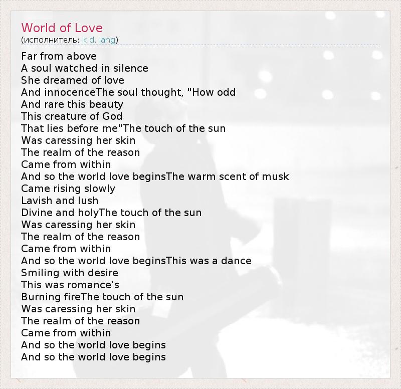Far from above A soul watched in silence She dreamed of love And innocenceThe soul thought, "How odd And rare this beauty This creature of God That lies before me"The touch of the sun Was caressing her skin The realm of the reason Came from within And so the world love beginsThe warm scent of musk Came rising slowly Lavish and lush Divine and holyThe touch of the sun Was caressing her skin The realm of the reason Came from within And so the world love beginsThis was a dance Smiling with desire This was romance's Burning fireThe touch of the sun Was caressing her skin The realm of the reason Came from within And so the world love begins And so the world love begins
