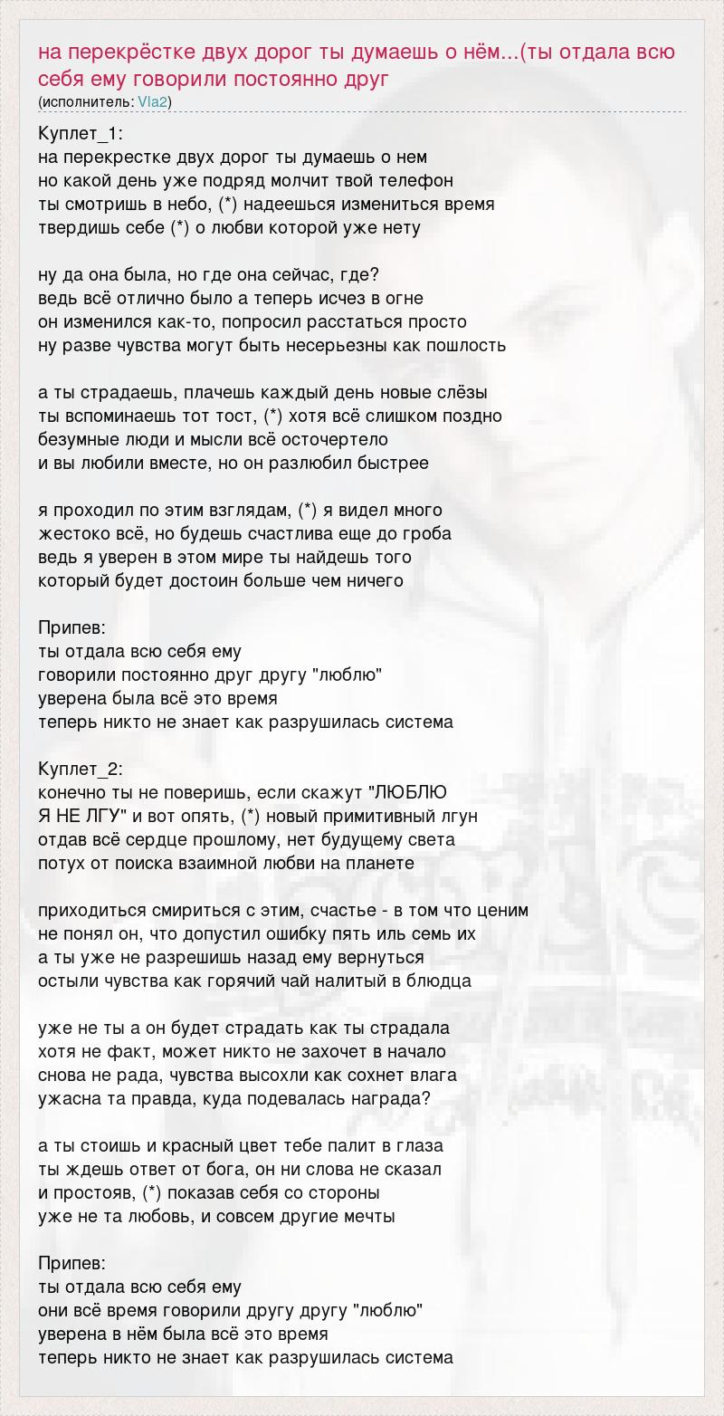 ГлавнаяИсполнителиVla2На перекрёстке двух дорог ты думаешь о нём...(ты отдала всю себя ему г