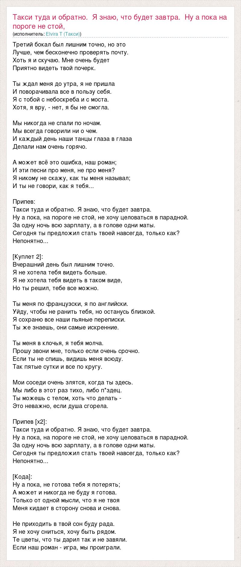 Третий бокал был лишним точно, но это Лучше, чем бесконечно проверять почту. Хоть я и скучаю. Мне очень будет Приятно видеть твой почерк. Ты ждал меня до утра, я не пришла И поворачивала все в пользу себя. Я с тобой с небоскреба и с моста. Хотя, я вру, - нет, я бы не смогла. Мы никогда не спали по ночам. Мы всегда говорили ни о чем. И каждый день наши танцы глаза в глаза Делали нам очень горячо. А может всё это ошибка, наш роман; И эти песни про меня, не про меня? Я никому не скажу, как ты меня называл; И ты не говори, как я тебя... Припев: Такси туда и обратно. Я знаю, что будет завтра. Ну а пока, на пороге не стой, не хочу целоваться в парадной. За одну ночь всю зарплату, а в голове одни маты. Сегодня ты предложил стать твоей навсегда, только как? Непонятно... [Куплет 2]: Вчерашний день был лишним точно. Я не хотела тебя видеть больше. Я не хотела тебя видеть в таком виде, Но ты решил, тебе все можно. Ты меня по французски, я по английски. Уйду, чтобы не ранить тебя, но останусь близкой. Я сохраню все наши пьяные переписки. Ты же знаешь, они самые искренние. Ты меня в клочья, я тебя молча. Прошу звони мне, только если очень срочно. Если ты не спишь, видишь меня всюду. Так пятые сутки и все по кругу. Мои соседи очень злятся, когда ты здесь. Мы либо в этот раз тихо, либо п*здец. Ты можешь с телом, хоть что делать - Это неважно, если душа сгорела. Припев [x2]: Такси туда и обратно. Я знаю, что будет завтра. Ну а пока, на пороге не стой, не хочу целоваться в парадной. За одну ночь всю зарплату, а в голове одни маты. Сегодня ты предложил стать твоей навсегда, только как? Непонятно... [Кода]: Ну а пока, не готова тебя я потерять; А может и никогда не буду я готова. Только от одной мысли, что я не твоя Меня кидает в сторону снова и снова. Не приходить в твой сон буду рада. Я не хочу сниться, хочу быть рядом. Те цветы, что ты дарил так и не завяли. Если наш роман - игра, мы проиграли.