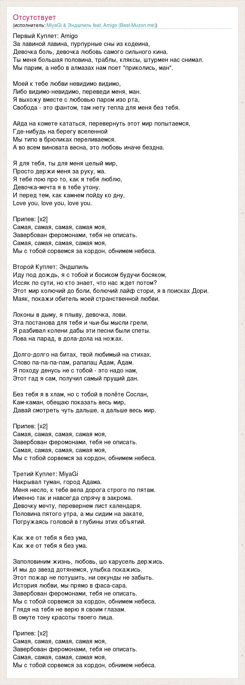 Первый Куплет: Amigo За лавиной лавина, пурпурные сны из кодеина, Девочка боль, девочка любовь самого сильного кина. Ты меня большая половина, траблы, кляксы, штурмен нас снимал. Мы парим, а небо в алмазах нам поет "приколись, ман". Моей к тебе любви невидимо видимо, Либо видимо-невидимо, переведи меня, ман. Я выхожу вместе с любовью паром изо рта, Свобода - это фантом, там нету тепла для меня без тебя. Айда на комете кататься, перевернуть этот мир попытаемся, Где-нибудь на берегу вселенной Мы типо в брюликах переливаемся. А во всем виновата весна, это любовь иначе бездна. Я для тебя, ты для меня целый мир, Просто держи меня за руку, ма. Я тебе пою про то, как я тебя люблю, Девочка-мечта я в тебе утону. И перед тем, как камнем пойду ко дну, Love you, love you, love you. Припев: [х2] Самая, самая, самая, самая моя, Завербован феромонами, тебя не описать. Самая, самая, самая, самая моя, Мы с тобой сорвемся за кордон, обнимем небеса. Второй Куплет: Эндшпиль Иду под дождь, я с тобой и босиком будучи босяком, Иссяк по сути, но кто знает, что нас ждет потом? Этот мир колючий до боли, болючий лайф стори, я в поисках Дори. Маяк, покажи обитель моей странственной любви. Локоны в дыму, я плыву, девочка, лови. Эта постанова для тебя и чьи-бы мысли грели, Я разбивал колени дабы эти песни были спеты. Лова на парад, в дола-дола на ножах. Долго-долго на битах, твой любимый на стихах. Слово па-па-па-пам, рапапац Адам, Адам. Я походу денусь не с тобой - это надо нам, Этот гад я сам, получил самый прущий дан. Без тебя я в хлам, но с тобой в полёте Сослан, Кам-каман, обещаю показать весь мир, Давай смотреть чуть дальше, а дальше весь мир. Припев: [х2] Самая, самая, самая, самая моя, Завербован феромонами, тебя не описать. Самая, самая, самая, самая моя, Мы с тобой сорвемся за кордон, обнимем небеса. Третий Куплет: MiyaGi Накрывал туман, город Адама. Меня несло, к тебе вела дорога строго по пятам. Именно так и навсегда спрячу в закрома. Девочку мечту, перевернем лист календаря. Половина пятого утра, а мы сидим на закате, Погружаясь головой в глубины этих объятий. Как же от тебя я без ума, Как же от тебя я без ума. Заполовиним жизнь, любовь, шо карусель держись. И мы до звезд дотянемся, улыбка покажись. Этот пожар не потушить, ни секунды не забыть. История любви, мы прямо в фаса-сара. Завербован феромонами, тебя не описать. Мы с тобой сорвемся за кордон, обнимем небеса. Глядя на тебя не верю я своим глазам. В омуте тону красоты твоего лица. Припев: [х2] Самая, самая, самая, самая моя, Завербован феромонами, тебя не описать. Самая, самая, самая, самая моя, Мы с тобой сорвемся за кордон, обнимем небеса.