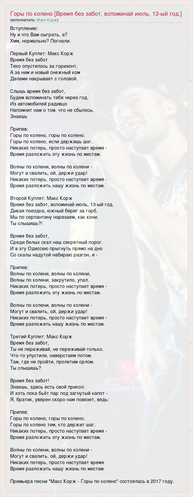 Вступление: Ну и что Вам сыграть, а? Хмм, нормально? Погнали. Первый Куплет: Макс Корж Время без забот Тихо опустилось за горизонт, А за ним и новый снежный ком Делами накрывает с головой. Слышь время без забот, Будем вспоминать тебя через год. Из автомобилей радивцо Напомнит нам о том, что не сбылось. Знаешь Припев: Горы по колено, горы по колено. Горы по колено, если держишь шаг. Никаких потерь, просто наступает время - Время разложить эту жизнь по местам. Волны по колени, волны по колени - Могут и свалить, ой, держи удар! Никаких потерь, просто наступает время - Время разложить нашу жизнь по местам. Второй Куплет: Макс Корж Время без забот, вспоминай июль, 13-ый год. Дикая поездка, южный берег за горб. Мы по серпантину нарезаем, как кони. Ты слышишь?! Время без забот, Среди белых скал наш секретный порог. И в эту Одиссею прыгнуть прямо на дно Со скалы надутой набираю разгон, и - Припев: Волны по колени, волны по колени, Волны по колени, закрутило, упал. Никаких потерь, просто наступает время - Время разложить эту жизнь по местам. Волны по колени, волны по колени - Могут и свалить, ой, держи удар! Никаких потерь, просто наступает время - Время разложить нашу жизнь по местам. Третий Куплет: Макс Корж Время без забот, Ты не переживай, не переживай-только. Что-то упустили, наверстаем потом. Там, где не пройти, пролетим орлом. Ты слышишь? Время без забот! Знаешь, здесь есть свой прикол. И хоть пока бьёт пар под загнутый капот - Я, братик, уверен скоро нам повезет, ведь: Припев: Горы по колено, горы по колено. Горы по колено тем, кто держит шаг. Никаких потерь, просто наступает время - Время разложить эту жизнь по местам. Волны по колени, волны по колени - Могут и свалить, ой, держи удар! Никаких потерь, просто наступает время Время разложить нашу жизнь по местам. Премьера песни "Макс Корж - Горы по колено" состоялась в 2017 году.