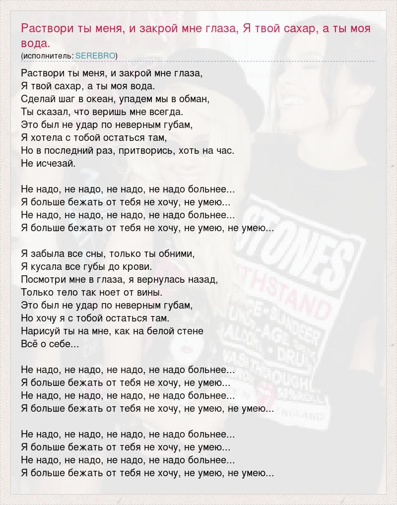 Раствори ты меня, и закрой мне глаза, Я твой сахар, а ты моя вода. Сделай шаг в океан, упадем мы в обман, Ты сказал, что веришь мне всегда. Это был не удар по неверным губам, Я хотела с тобой остаться там, Но в последний раз, притворись, хоть на час. Не исчезай. Не надо, не надо, не надо, не надо больнее... Я больше бежать от тебя не хочу, не умею... Не надо, не надо, не надо, не надо больнее... Я больше бежать от тебя не хочу, не умею, не умею... Я забыла все сны, только ты обними, Я кусала все губы до крови. Посмотри мне в глаза, я вернулась назад, Только тело так ноет от вины. Это был не удар по неверным губам, Но хочу я с тобой остаться там. Нарисуй ты на мне, как на белой стене Всё о себе... Не надо, не надо, не надо, не надо больнее... Я больше бежать от тебя не хочу, не умею... Не надо, не надо, не надо, не надо больнее... Я больше бежать от тебя не хочу, не умею, не умею... Не надо, не надо, не надо, не надо больнее... Я больше бежать от тебя не хочу, не умею... Не надо, не надо, не надо, не надо больнее... Я больше бежать от тебя не хочу, не умею, не умею...