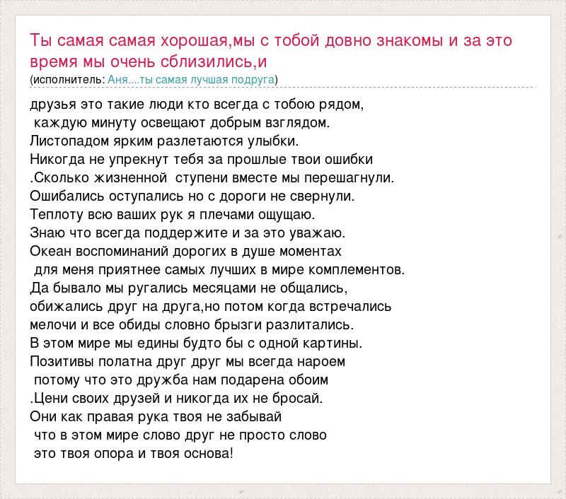 Главная→Исполнители→Аня....ты самая лучшая подруга→Ты самая самая хорошая,мы с тобой довно знакомы и за это время мы очень
