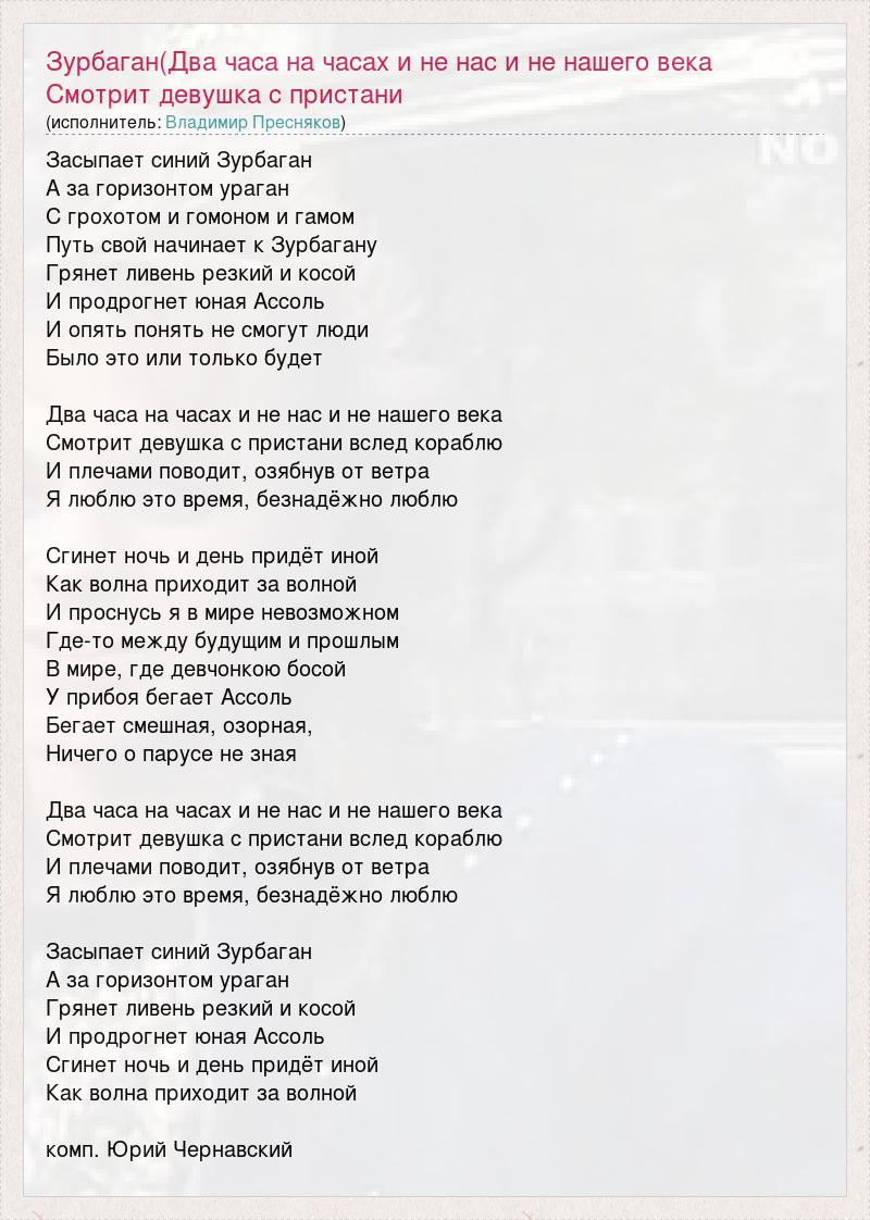 Засыпает синий Зурбаган А за горизонтом ураган С грохотом и гомоном и гамом Путь свой начинает к Зурбагану Грянет ливень резкий и косой И продрогнет юная Ассоль И опять понять не смогут люди Было это или только будет Два часа на часах и не нас и не нашего века Смотрит девушка с пристани вслед кораблю И плечами поводит, озябнув от ветра Я люблю это время, безнадёжно люблю Сгинет ночь и день придёт иной Как волна приходит за волной И проснусь я в мире невозможном Где-то между будущим и прошлым В мире, где девчонкою босой У прибоя бегает Ассоль Бегает смешная, озорная, Ничего о парусе не зная Два часа на часах и не нас и не нашего века Смотрит девушка с пристани вслед кораблю И плечами поводит, озябнув от ветра Я люблю это время, безнадёжно люблю Засыпает синий Зурбаган А за горизонтом ураган Грянет ливень резкий и косой И продрогнет юная Ассоль Сгинет ночь и день придёт иной Как волна приходит за волной комп. Юрий Чернавский